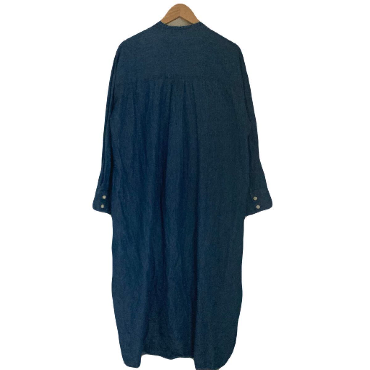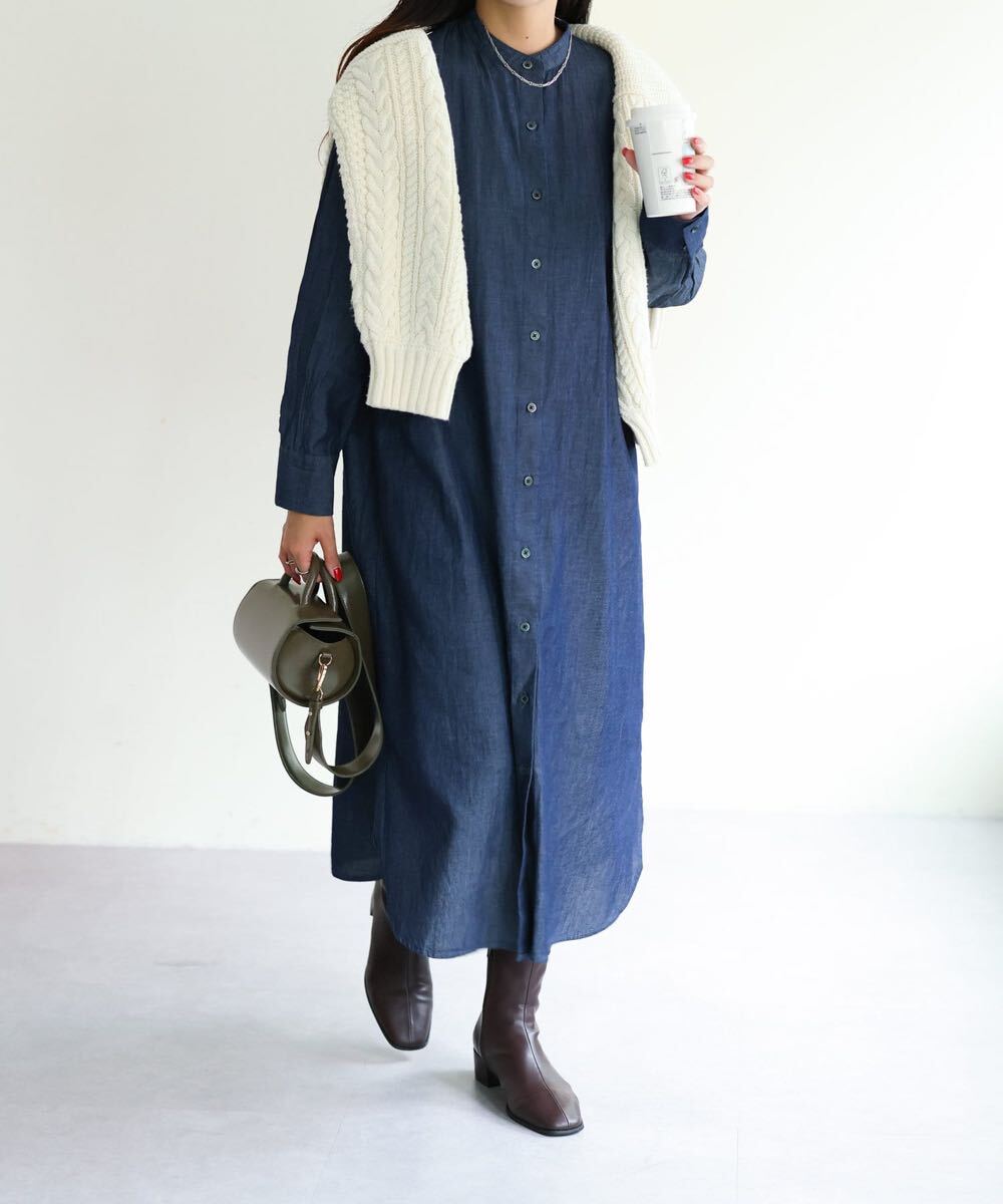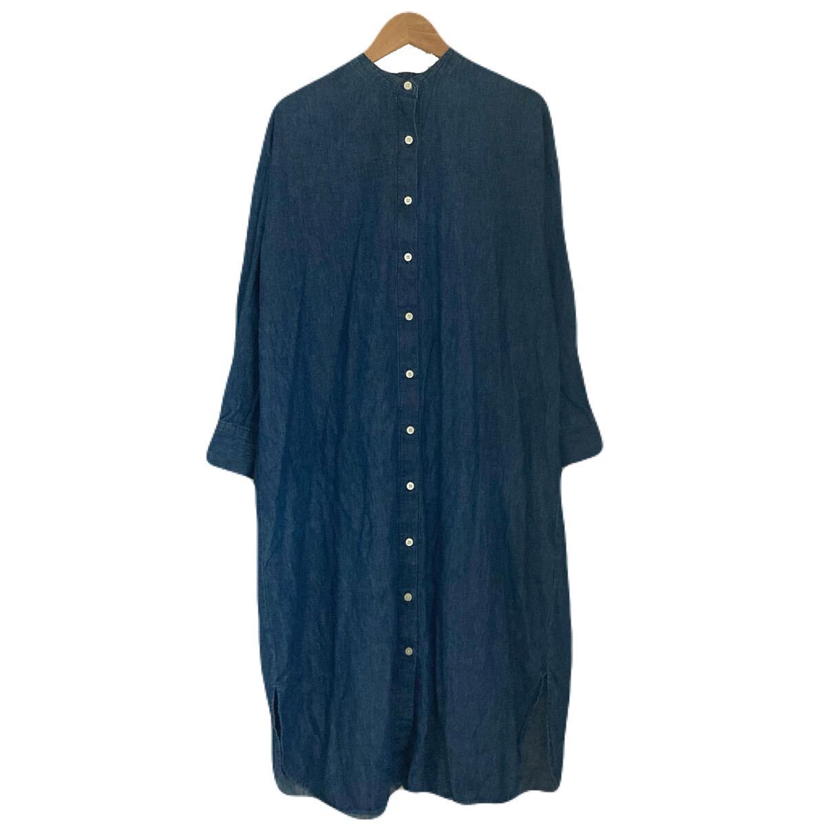 ディスコート デニム バンドカラー ロングワンピース ネイビー 無地 長袖 コットン ロングシーズン