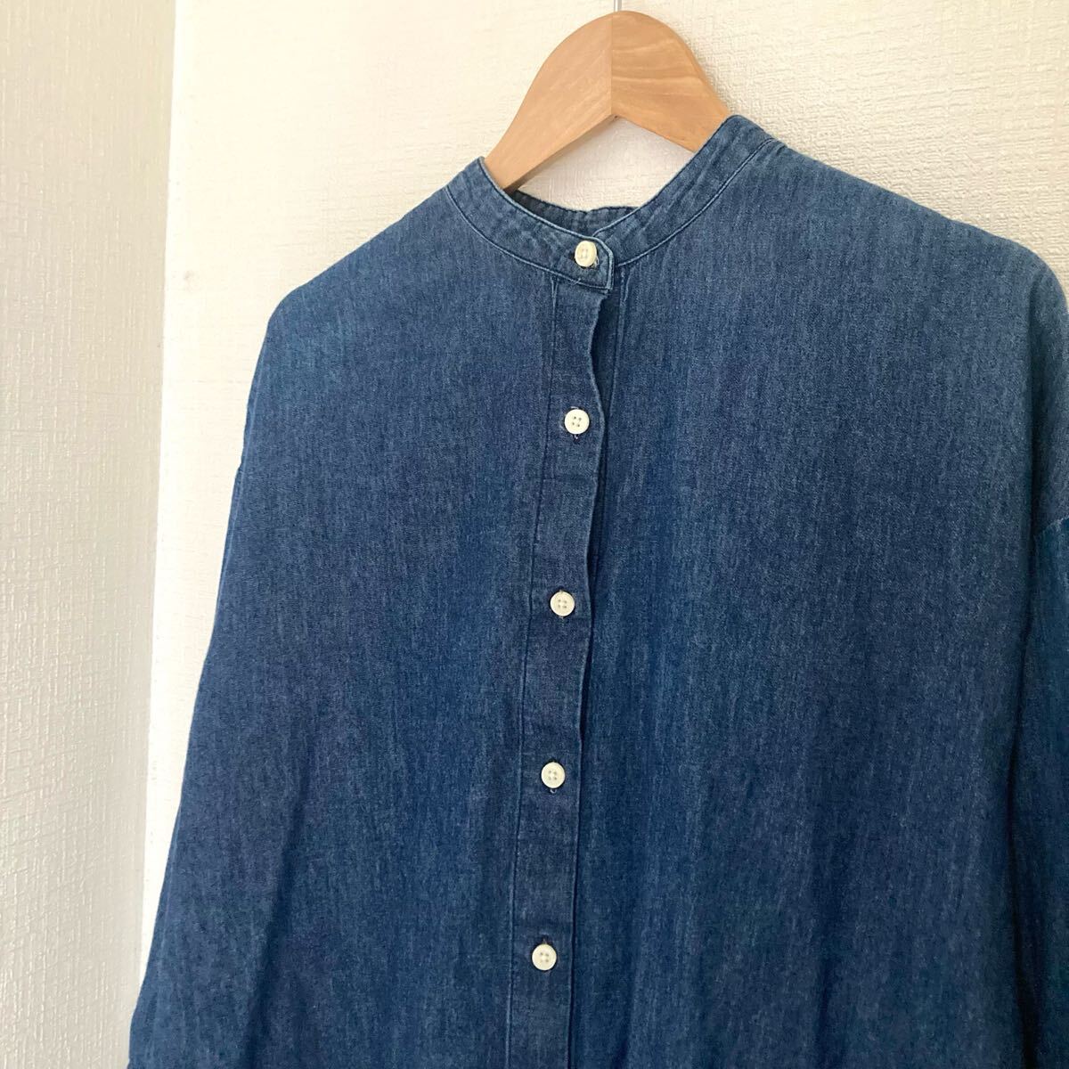 深みのあるネイビーカラーが印象的です。シンプル無地のデザインでありながら、バンドカラーが首元を引き立て、スタイリッシュな雰囲気を演出します。
