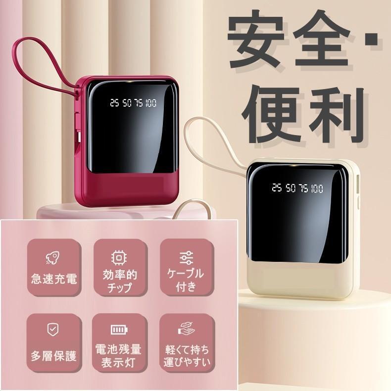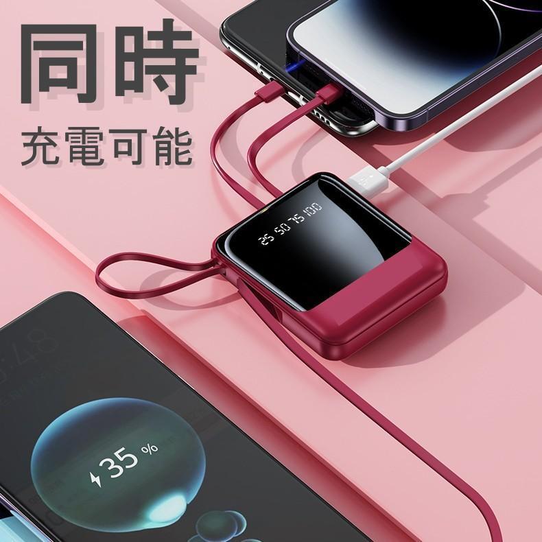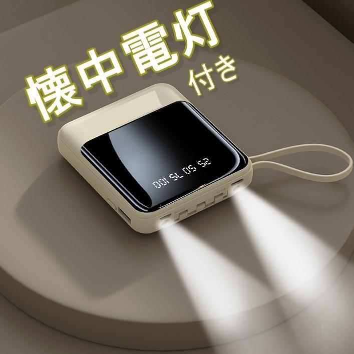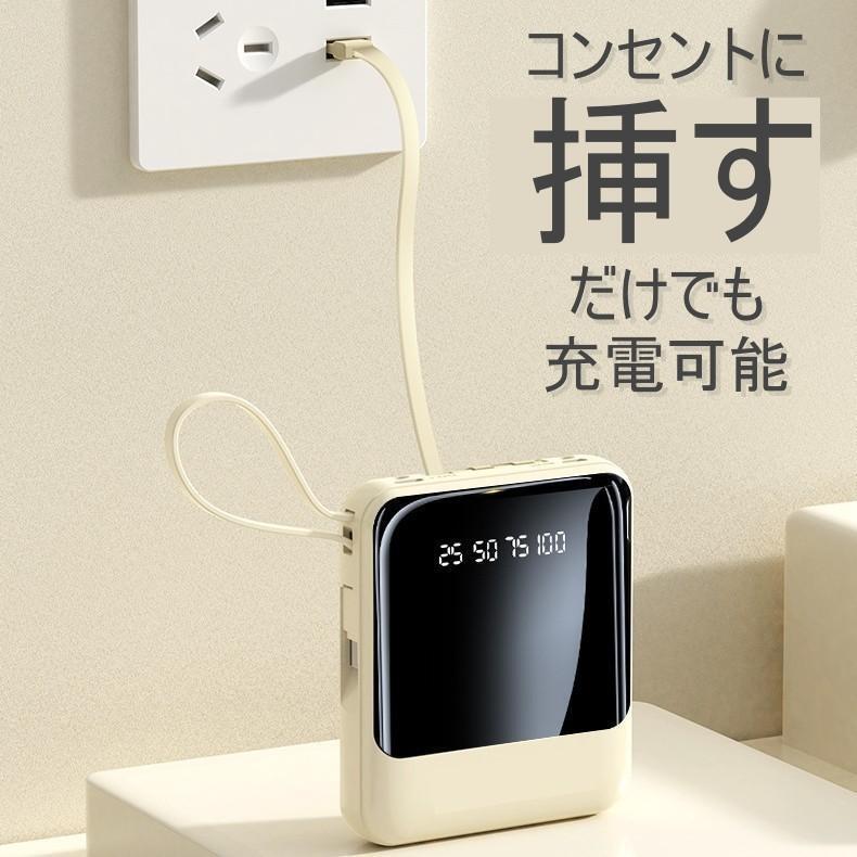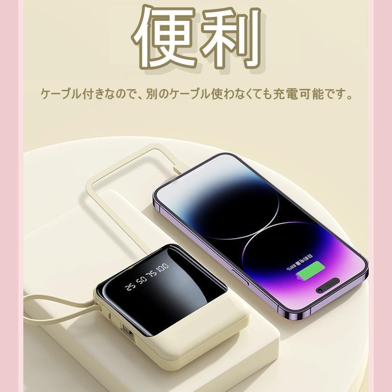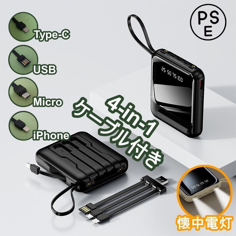 超小型モバイルバッテリー、4種類ケーブル内蔵付き、 直接充電式、 残量表示 iPhone15 Pro Max 14 13 Android対応可能です。