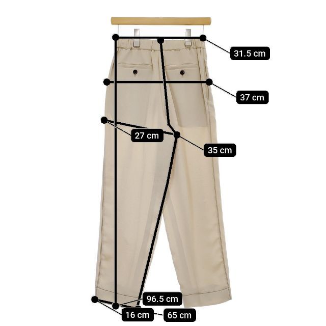 | 実寸サイズ | 総丈:約96.5cm ウエスト:約31.5cm ウエスト最長:約45cm 股上:約35cm 股下:約65cm ヒップ:約37cm ワタリ幅:約27cm 裾幅:約16cm ※記載以外のサイズが合わないことを理由とした返品はできませんので、 記載部分以外で実寸サイズの気になる箇所があれば必ず購入前にご質問ください。 |