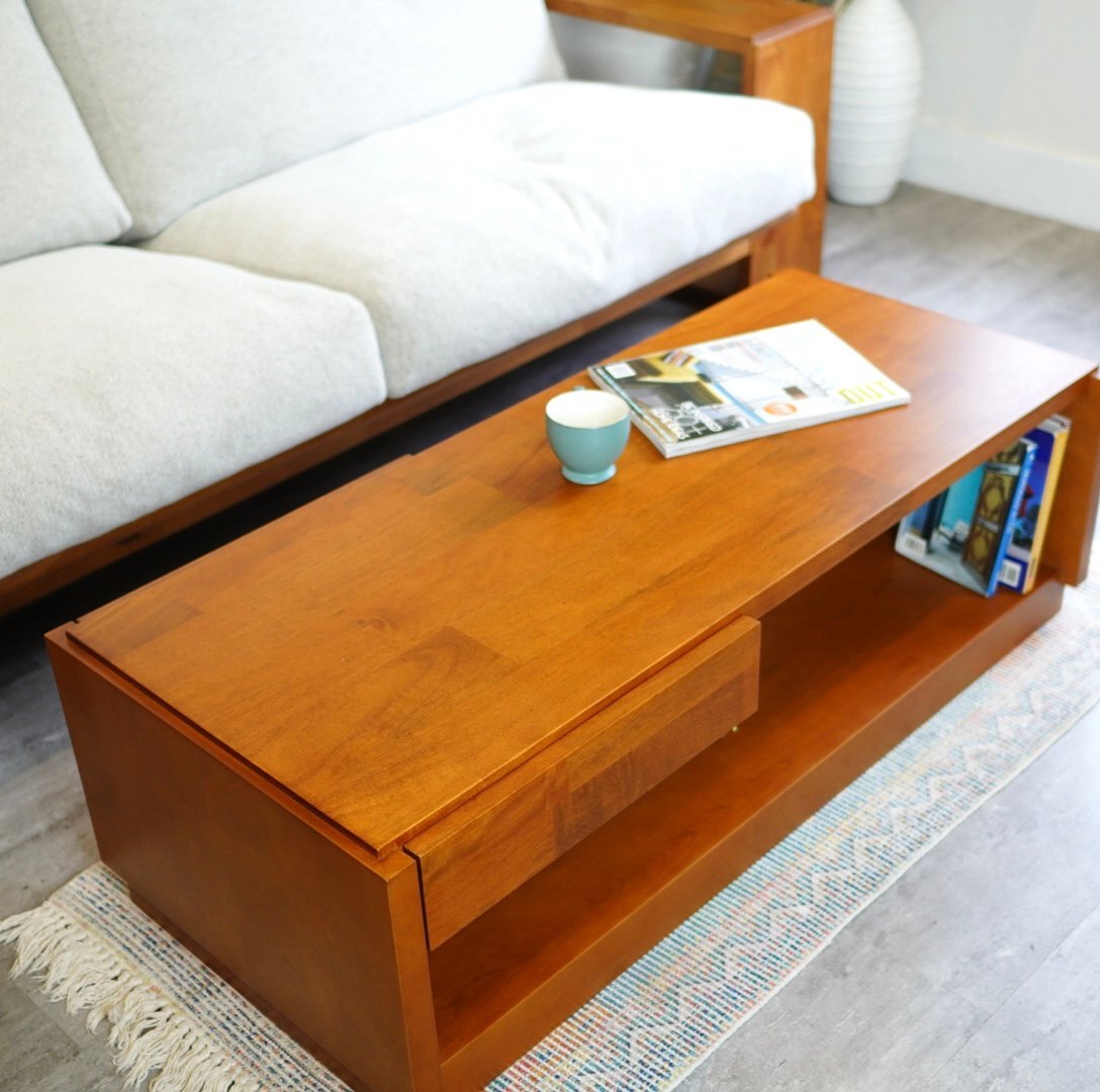 なにかと散らかりがちなリビングテーブル。こちらは片面に引出しがついているのでリモコンや新聞、生活雑貨など細々したものをちょっとしまっておくのに便利です! 1個隠す収納があるだけで生活が変わりますよ♪