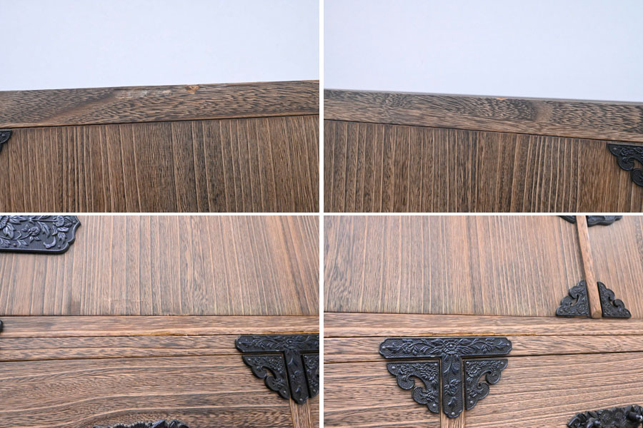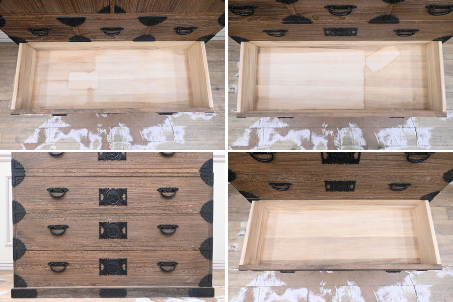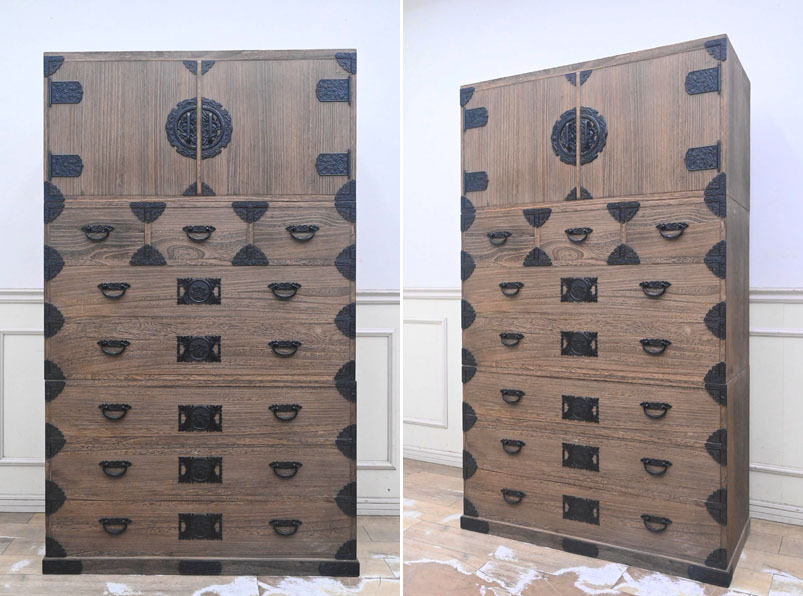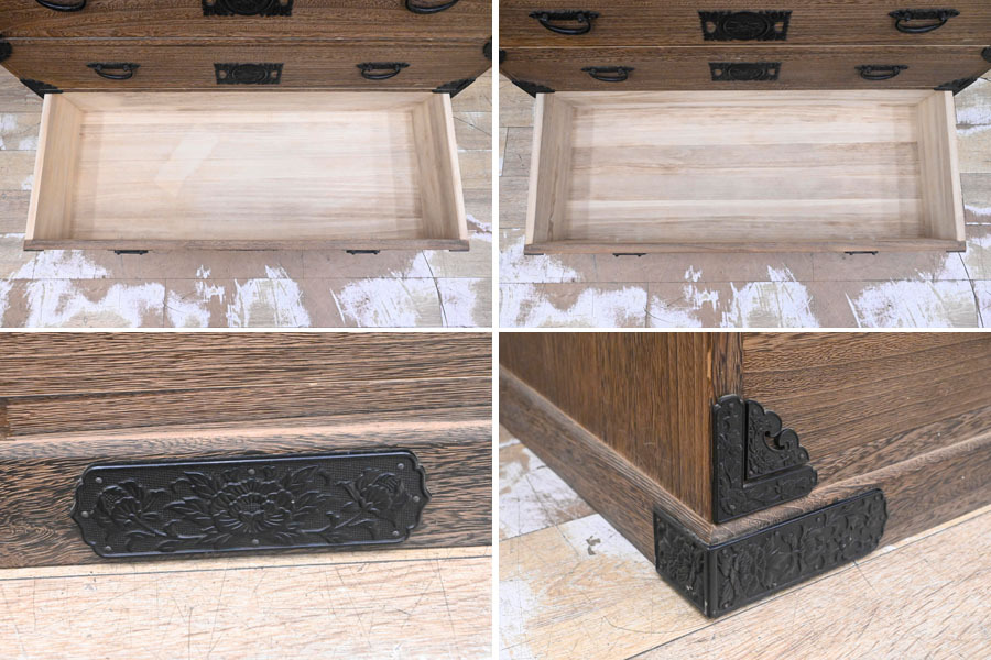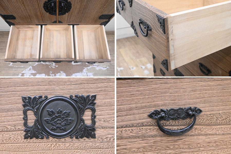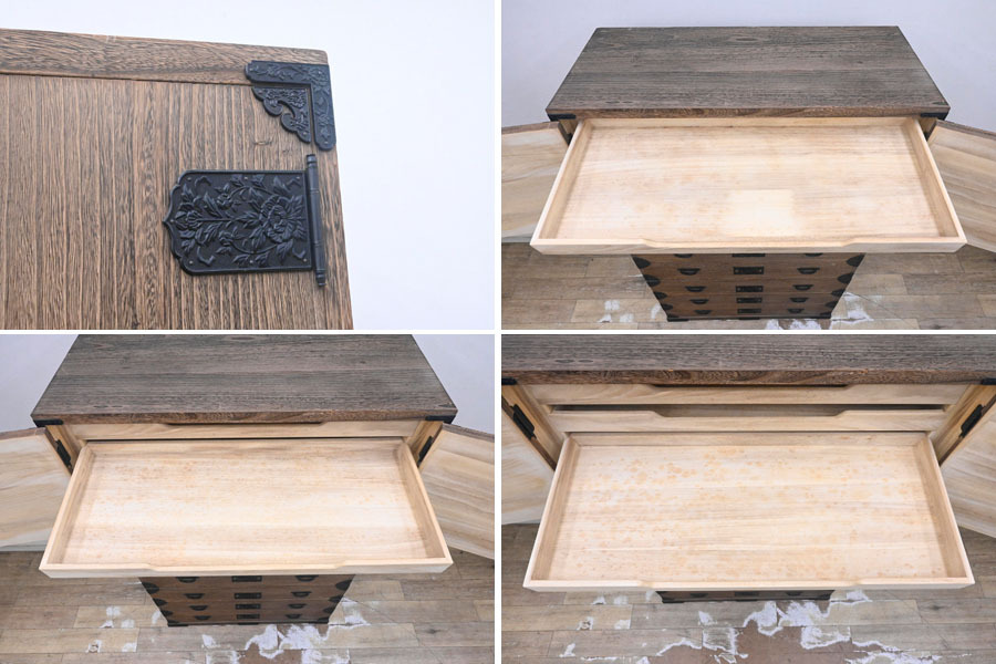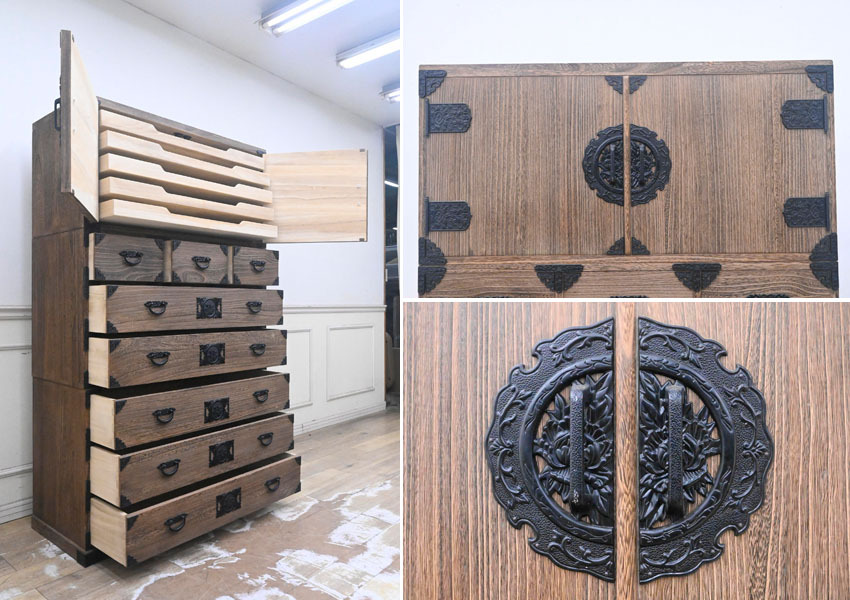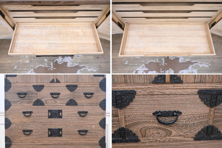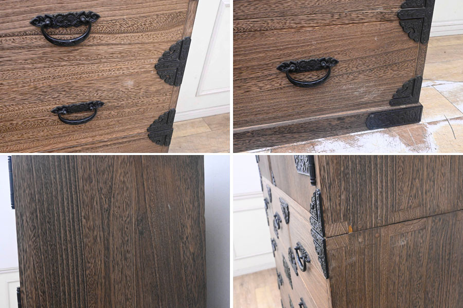 ----------------------------------------------------------------------------------------- ●送料や注意事項は必ずご確認下さい。落札後にトラブルになるケースが増えております。● ◆コンディションは写真・文章にて記載して有りますが、全てのキズの写真は掲載致しておりません。大きなダメージを除き見落とし、記載漏れが有る事はご了承下さい。 ◆当サイトにて出品する商品は多種多彩で、当方商品知識の無い物も多数ありますので落札後の質問やメンテナンス等にはお答えできません。 ◆入札された時点で、画像、文章をご理解していただいたものと判断させていただきます。不明な点は前もってQ&Aからお願い致します。入札後の質問やお電話等でのキャンセルは一切受け付け致しません。 ◆商品説明に「ノークレーム」と記載しているものに関しては、如何なる状況で届いても保証致しません。詳しくは注意事項の「商品到着後について」の最後に記載しておりますのでご確認下さい。 ---------------------------------------------------------------------------------------- 全てを桐無垢で仕上げた整理タンス、中古品の出品です。 良質な桐材を使用し日本の職人がアリ組等で丁寧に組み上げたお品です。 重量感ある金具が非常にマッチしてますね。 サイズ 幅106.5 奥45.5 高176 下段高65.5cm 【コンディション】 上段前面上下にガリキズ、欠け箇所、左側面下部奥ガリキズ、引出表面にガリキズあります。 開閉にひっかかりや固かったりがあります。 金具に塗装ハガレ、内部にシミ、その他所々欠け、キズ、打コン、汚れ等があります。 材質的に清掃は出来ておりません。 | ||