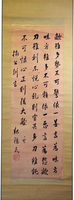 【書名】掛軸 細井平洲【著者】【解説】紙本 元表装 116×40cm 米沢藩主上杉鷹山の師。平洲がのこした言葉として米沢藩主になろうとしていた鷹山に送った「勇なるかな、勇なるかな勇にあらずして何をもって行わんや」がある。道徳の教科書に採用された。【刊行年】【数量】