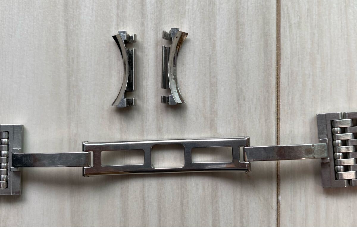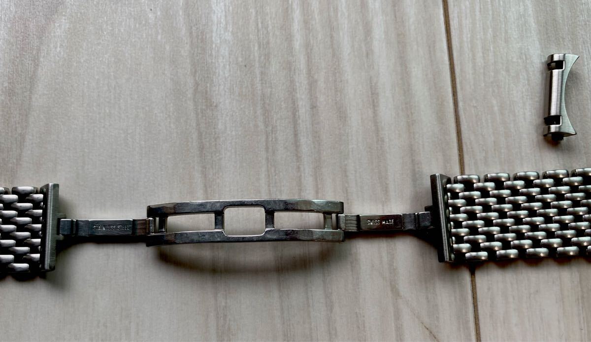 フリマの方で質問がありましたのでこちらでも回答します。ベルト長ですが端から端迄で15.5cmになります。あまりのコマはありません。ご検討の程よろしくお願いします。