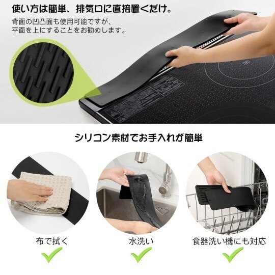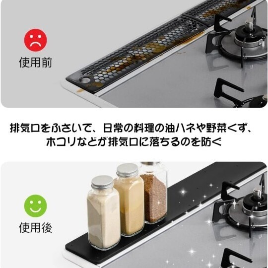 【排気口保護】排気口カバーが排気口をふさいでくれるので、日常の料理の油ハネや野菜くず、ホコリなどが排気口に落ちるのを防ぎ、毎日の面倒な排気口の掃除作業が減ります。