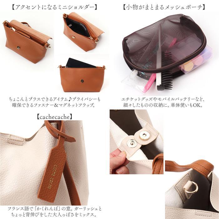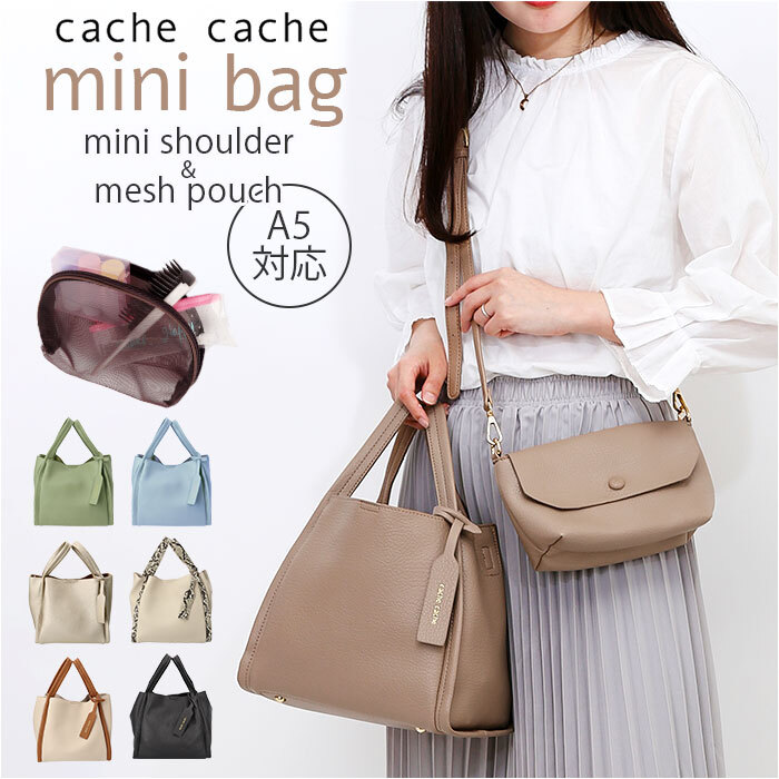 商品説明 | ・・【バリュアブルな3点セット☆】 ・一緒に使えるミニショルダー&メッシュポーチ付き!「cache cache ミニバッグ」。 ・【オン・オフ問わない上品な風合い】 ・バッグは柔らかな質感で、本革のようなフェイクレザー。落ち着きがあり色んなコーデにマッチ♪ ・【お好みに合わせてスタイルチェンジ】 ・ハンドバッグとして。ショルダーを取り付け、肩掛けや斜め掛け。ミニショルダーとセットでも! ・(※)付属のショルダーは、本体バッグとミニショルダー兼用です。 ・【マグネットでワンタッチオープン】 ・力いらずで簡単◎ガバっと開いて出し入れしやすく、閉じれば飛び出しもガード。 ・【A5対応ですっきりひとまとめ】 ・A5や500mlペットボトルが収まる大きさ。長財布やコスメポーチなどをIN。 ・【形崩れしにくく安定感をプラス】 ・ソフトな底板付きで、荷物を入れていない状態でも自立。キレイなフォルムもキープ。 ・【底面の擦れを軽減して長持ち】 ・底面四隅には、傷や汚れが付きにくい底鋲を装備。直置きも安心。 ・【アクセントになるミニショルダー】 ・ちょこんとプラスできるアイテム♪プライバシーも確保できるファスナー&マグネットフラップ。 ・【小物がまとまるメッシュポーチ】 ・エチケットグッズやモバイルバッテリーなど、細々したものの収納に。単体使いもOK。 ・【お気に入りを選べるカラー】 ・ベーシックや差し色などをラインナップ。シンプルで飽きが来ず、長く使えるのが嬉しい♪ ・【cachecache】 ・フランス語で「かくれんぼ」の意。ガーリッシュとちょっと背伸びをした大人っぽさをミックス。 |