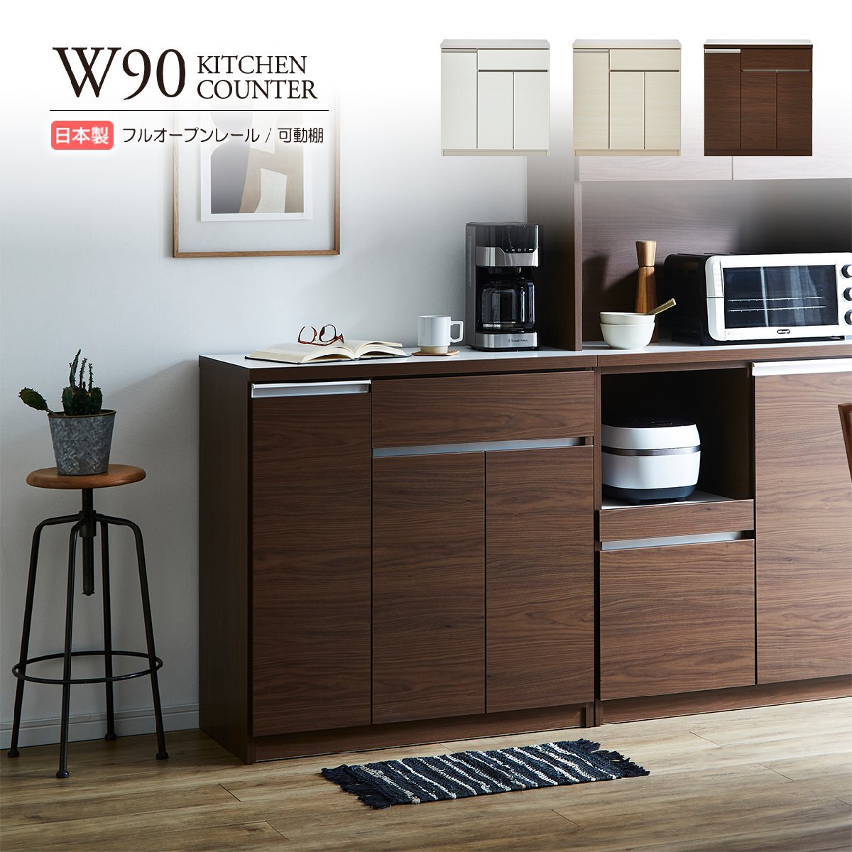 キッチンカウンター 食器棚 レンジ台 ロータイプ 幅90cm 間仕切り キッチン 収納 引き出し 木製 ブラウン