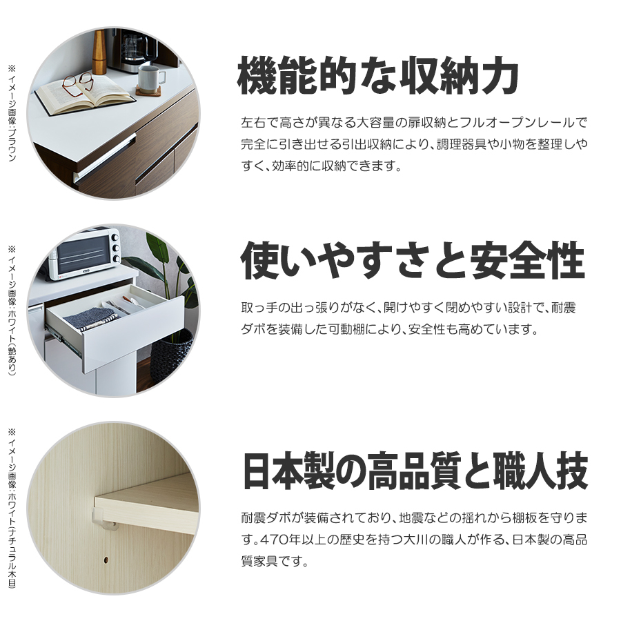 特  徴収納力、デザイン性を兼ね備えた国産日本製キッチンカウンター。
