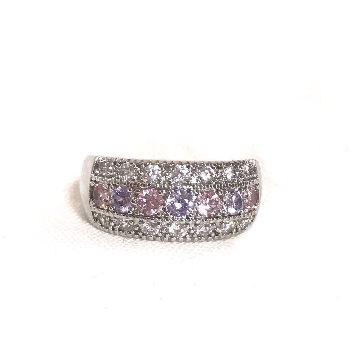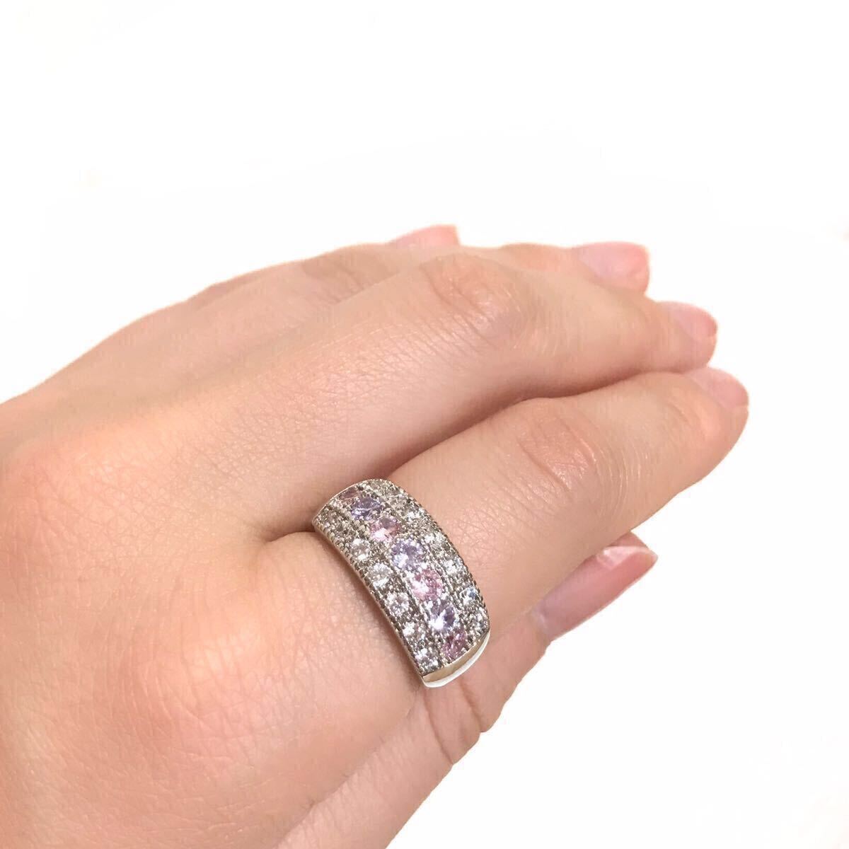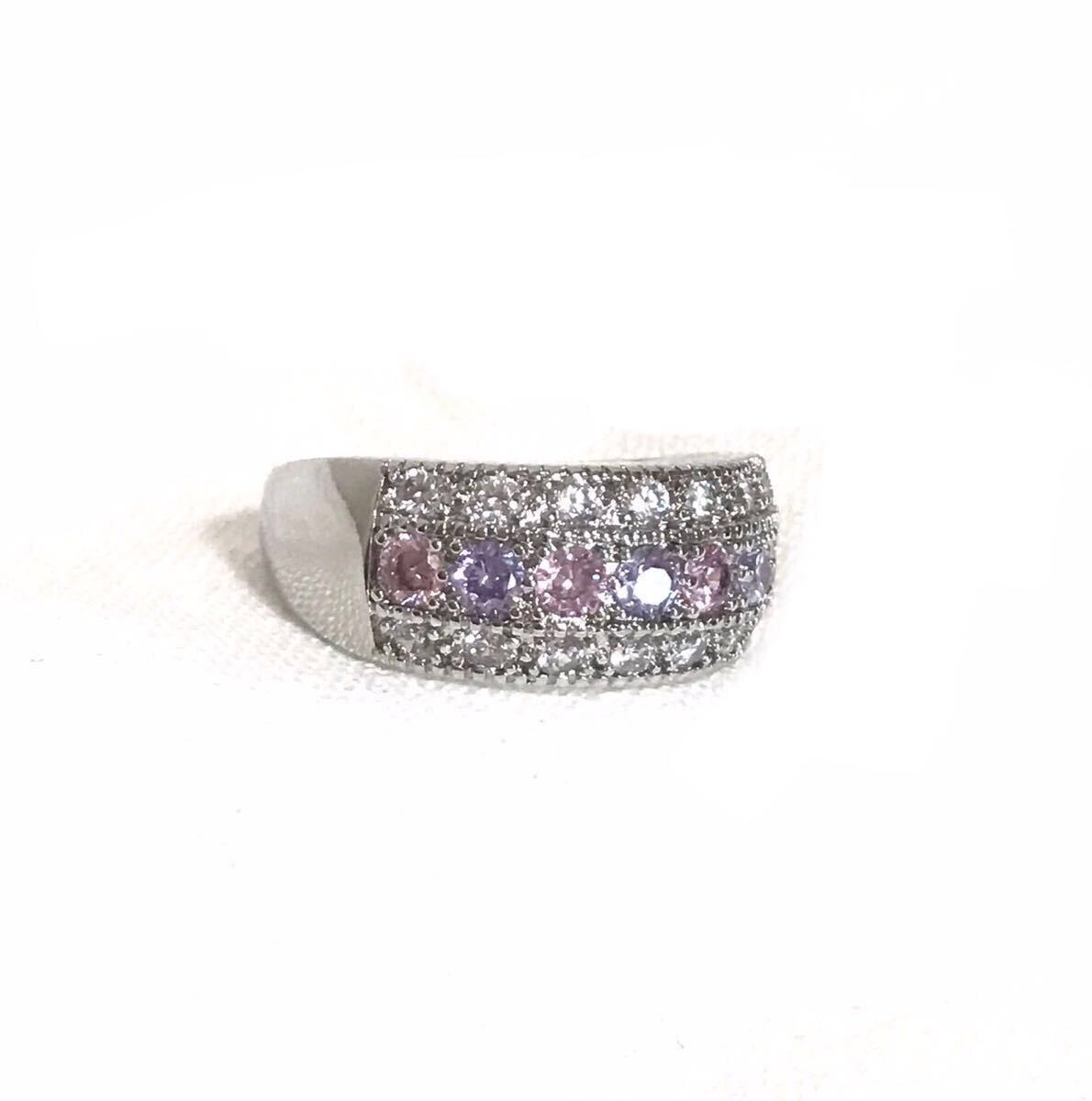 中央に並んだ淡いピンクとパープルのAAACZダイヤモンドと、その両側に並んだAAACZクリアーダイヤモンドがキラキラと輝いてとても綺麗です。淡い色合いで、上品な華やかさのあるお品です。