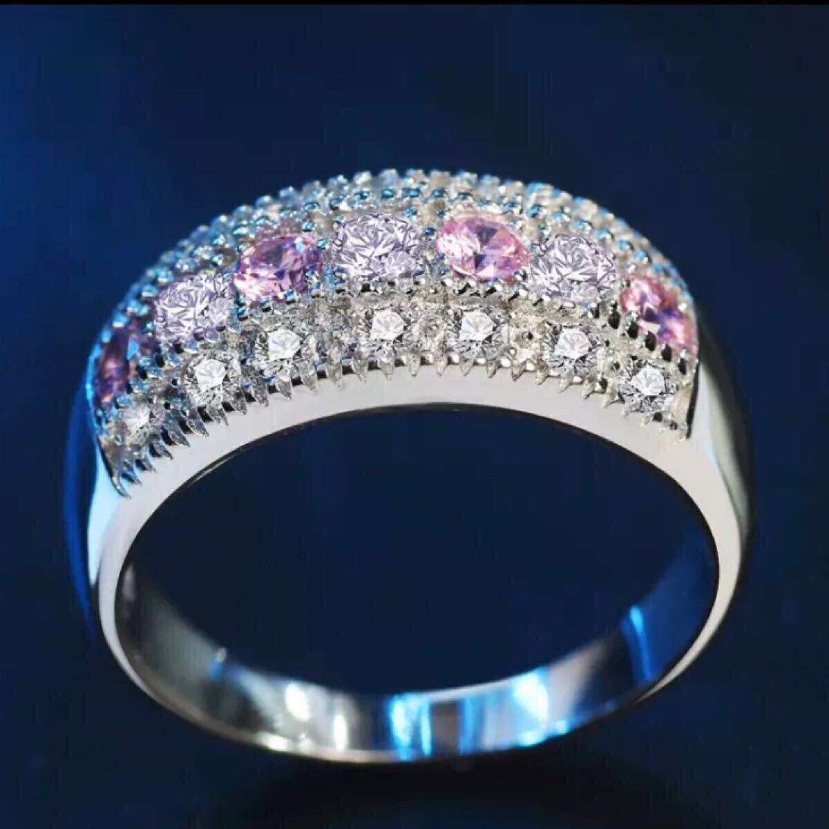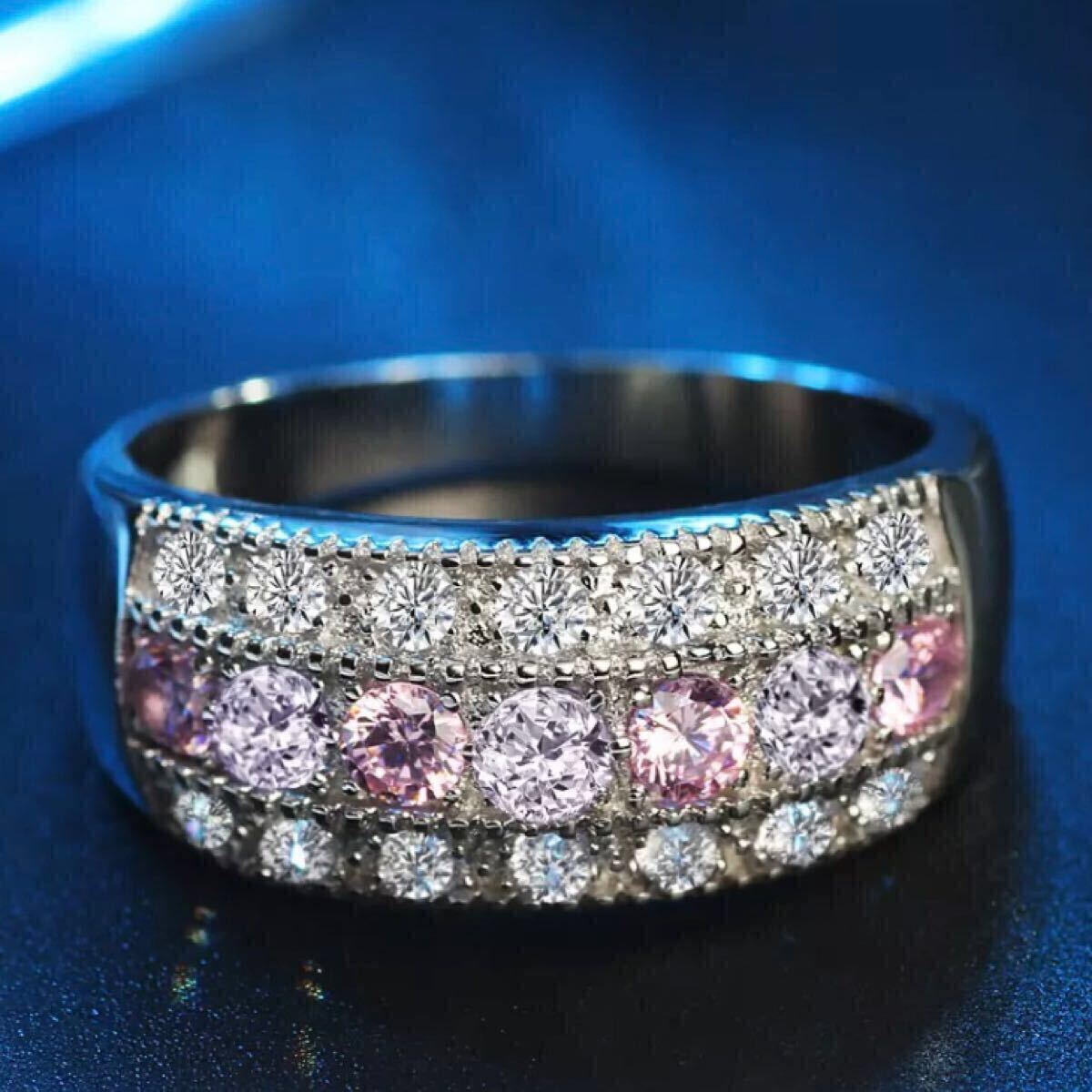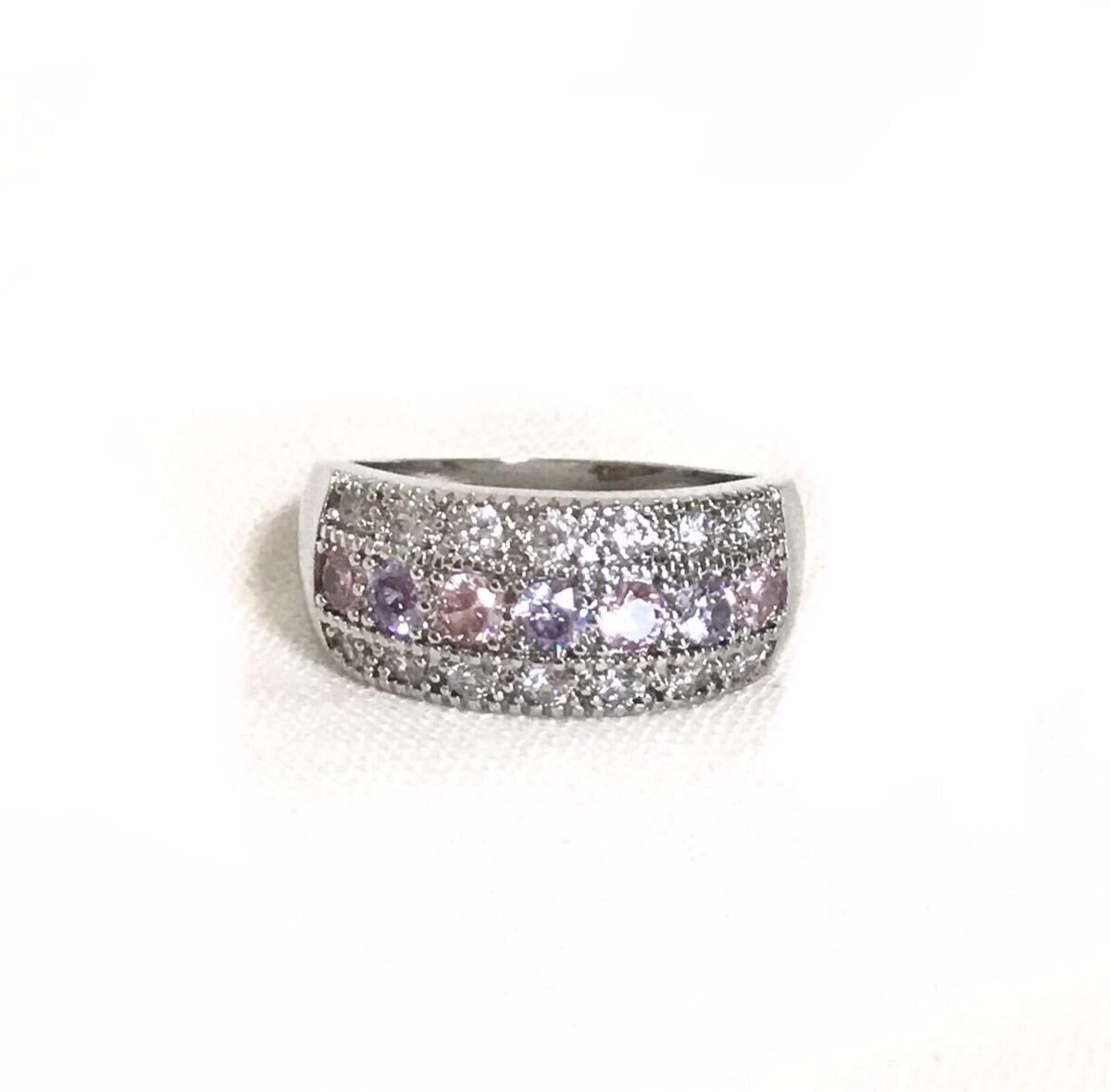 中央に並んだ淡いピンクとパープルのAAACZダイヤモンドと、その両側に並んだAAACZクリアーダイヤモンドがキラキラと輝いてとても綺麗です。淡い色合いで、上品な華やかさのあるお品です。