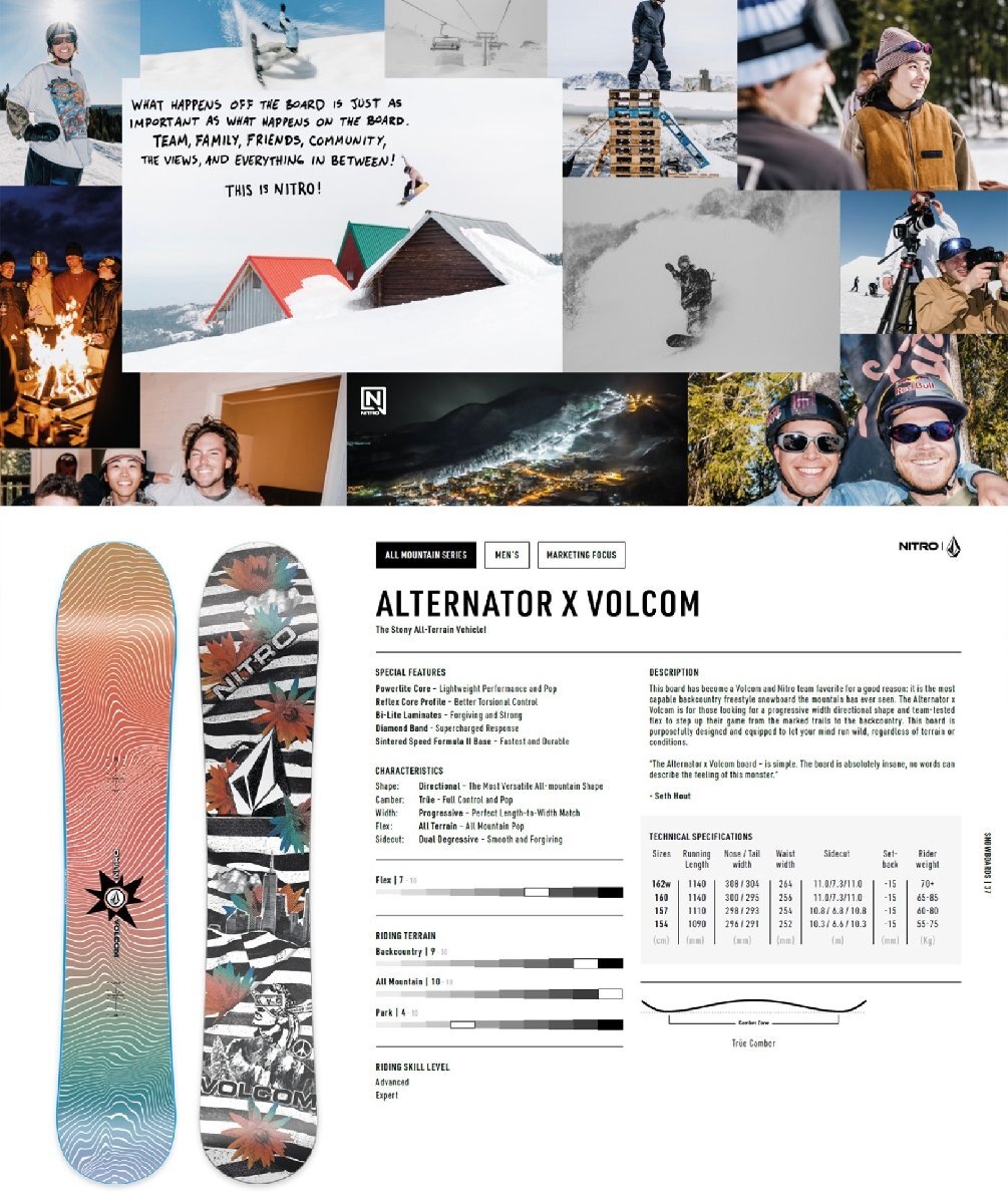 Alternator xVolcomは、プログレッシブな幅のディレクショナルシェイプとチームでテストされたフレックスを求める人のためのボードで、マークされたトレイルからバックカントリーまでステップアップできる。