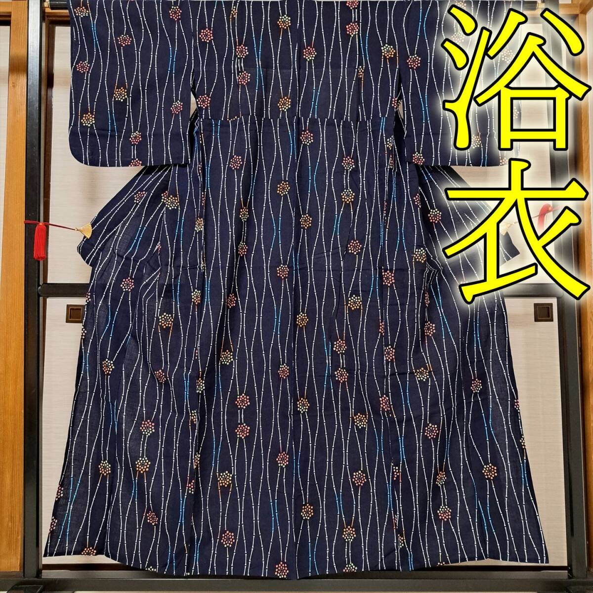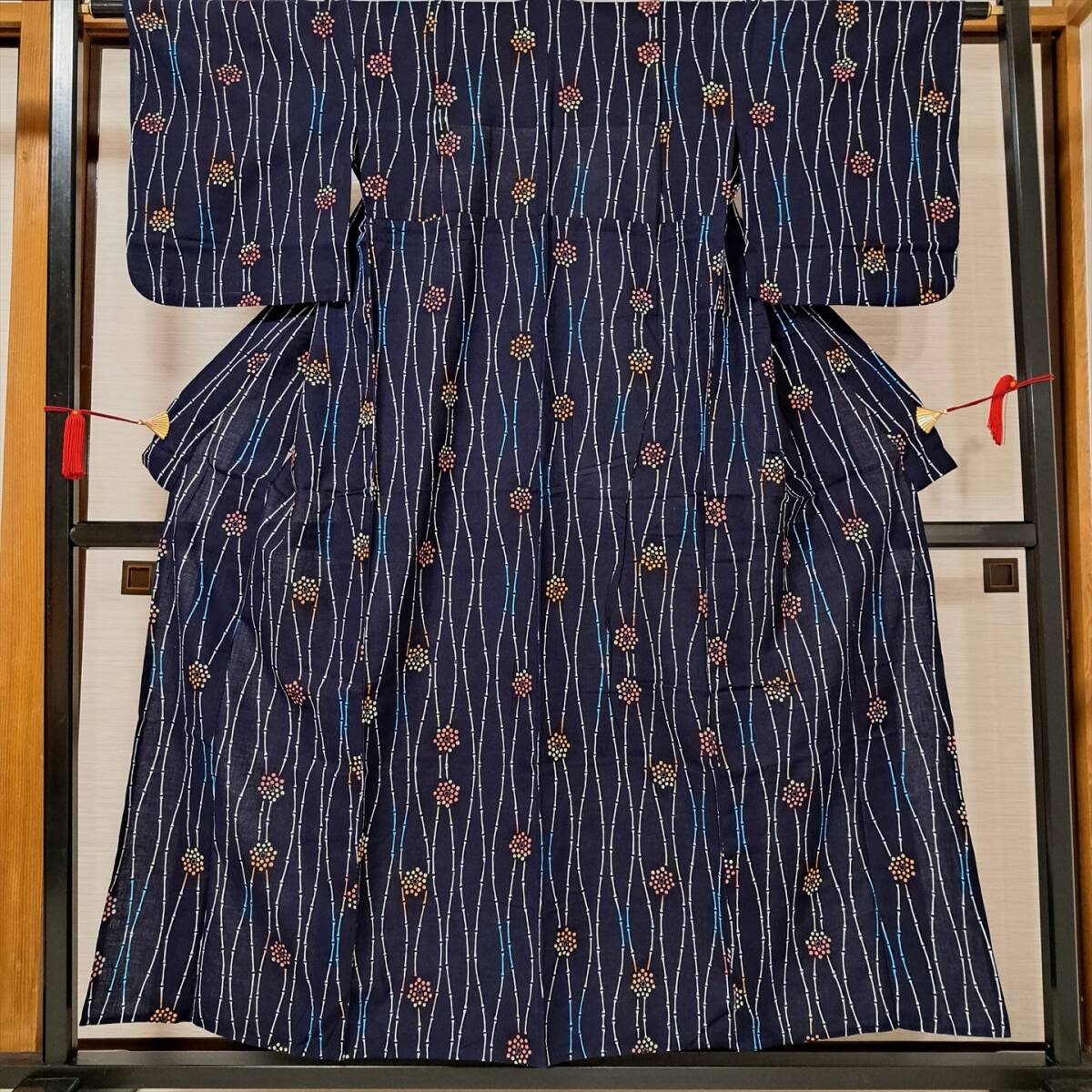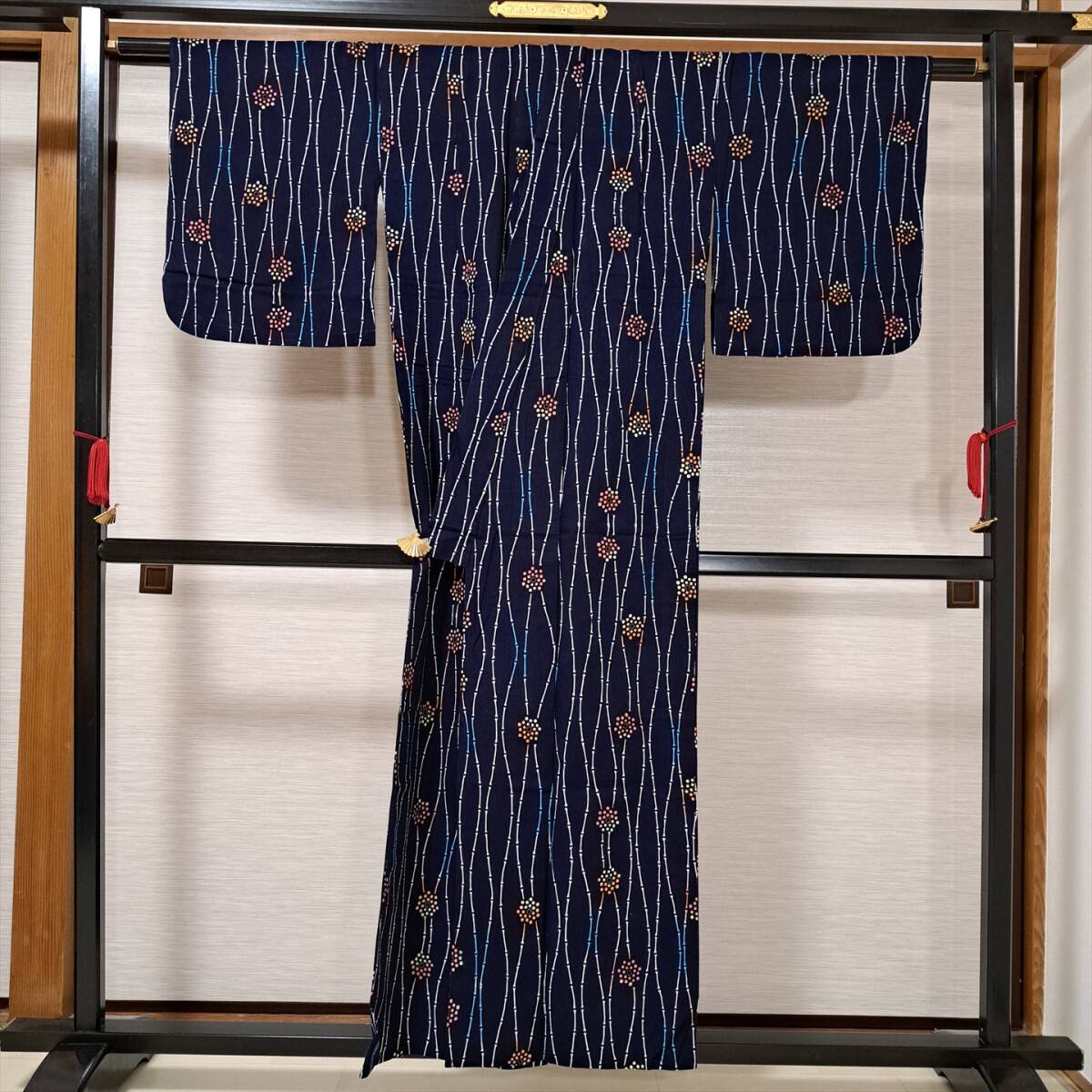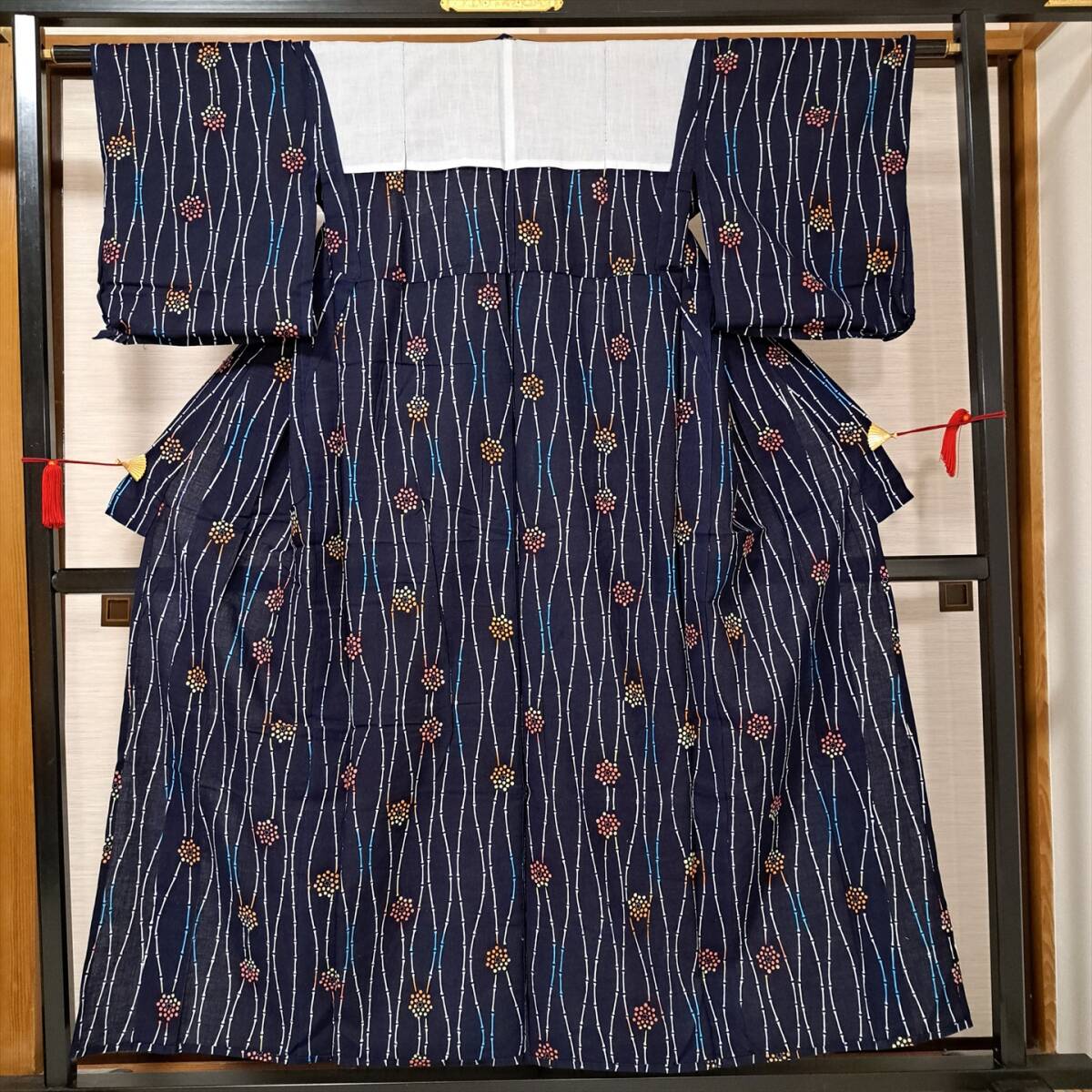 ■着物の越田■裄64身丈156 綿 浴衣 単衣 紺色 レトロな雰囲気 かわいい 注染染め ■ほ09U12a