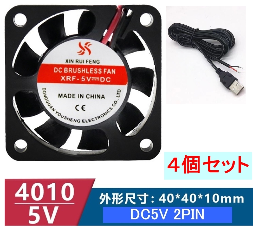 4個セット 小型クーリングファン V5V 40×40×10mm USBケーブル付き 401005 2ピン(冷却 DC ファン クーラー 空冷 USB 送風 排気 換気
