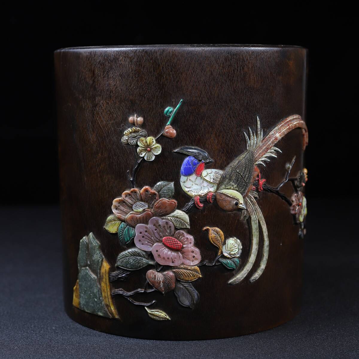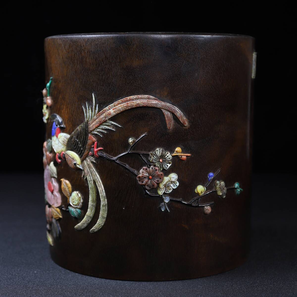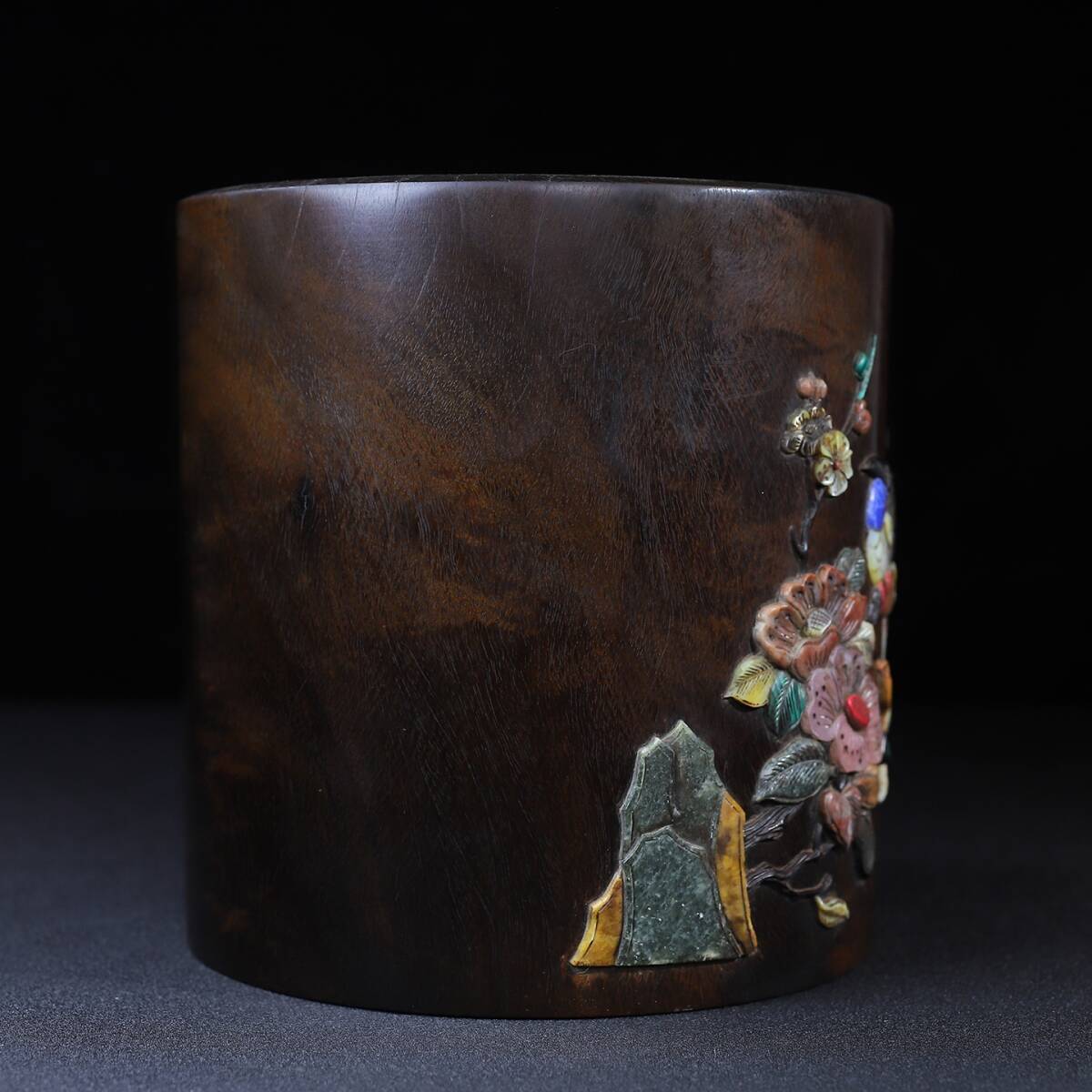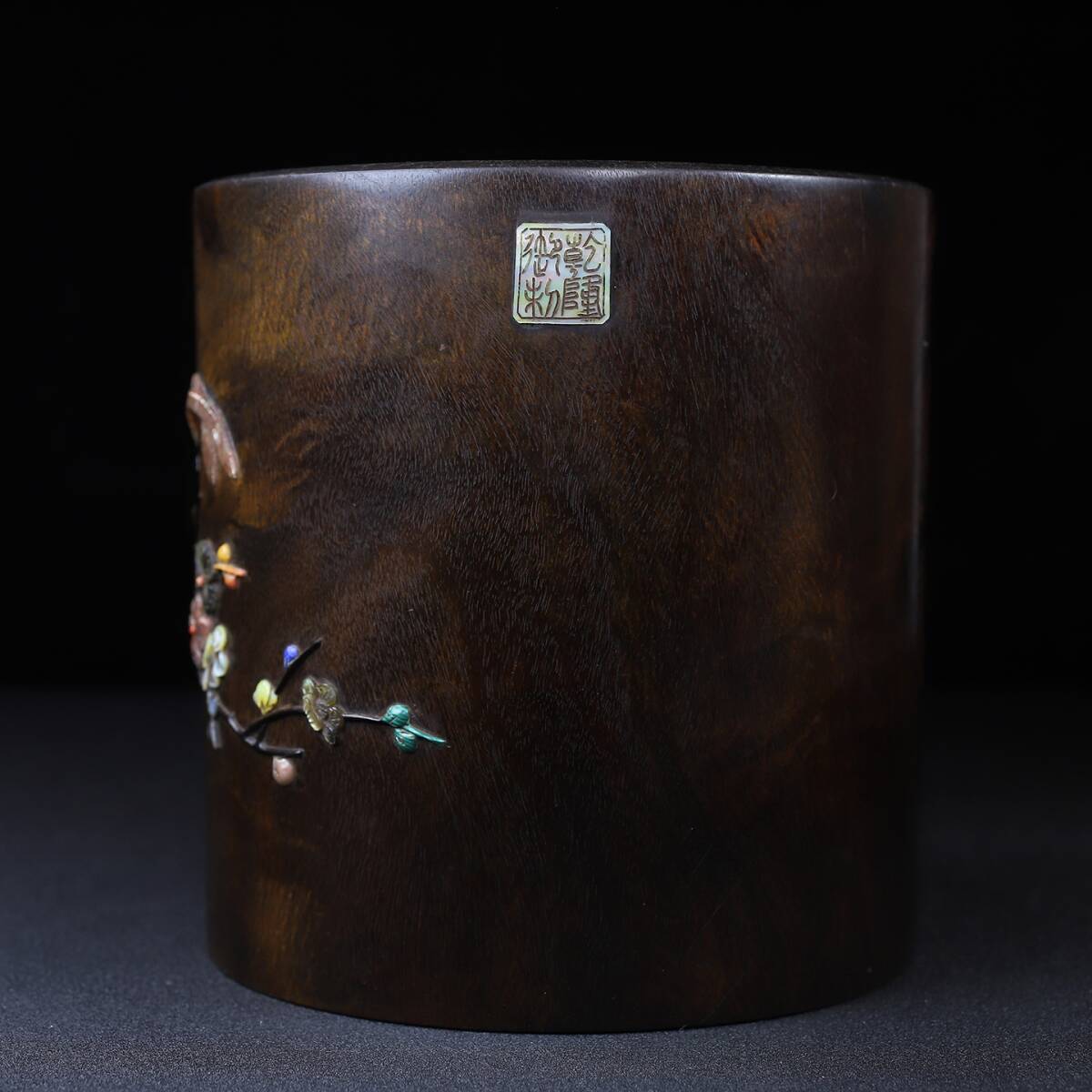 旧蔵 清 乾隆年製 花梨木 はめ込む彩貝 多寶圓筆筒 筆道具 文房具 木製 極細工 中国古玩 骨董品 古美味 206-21