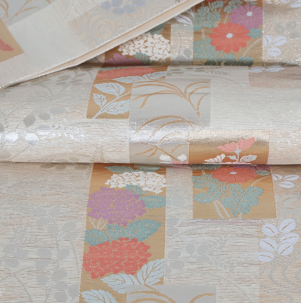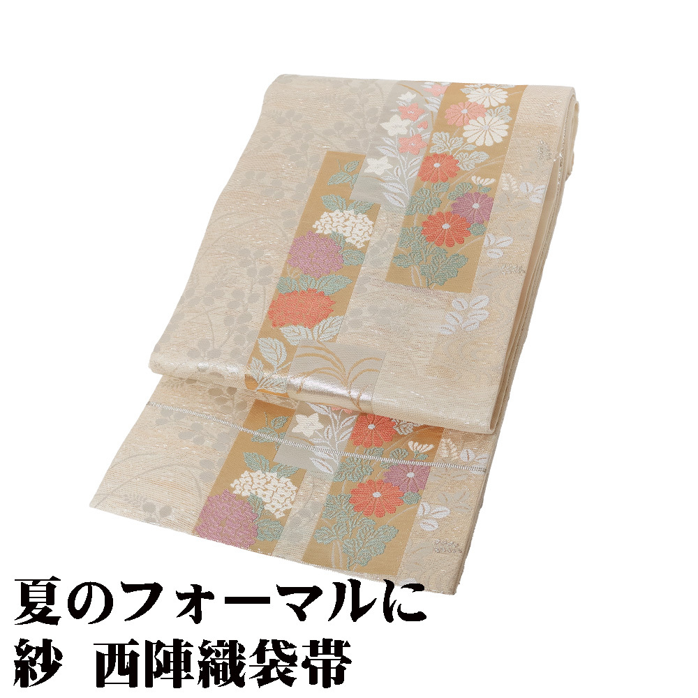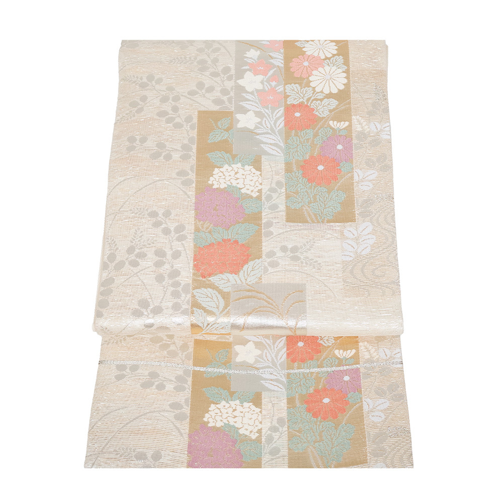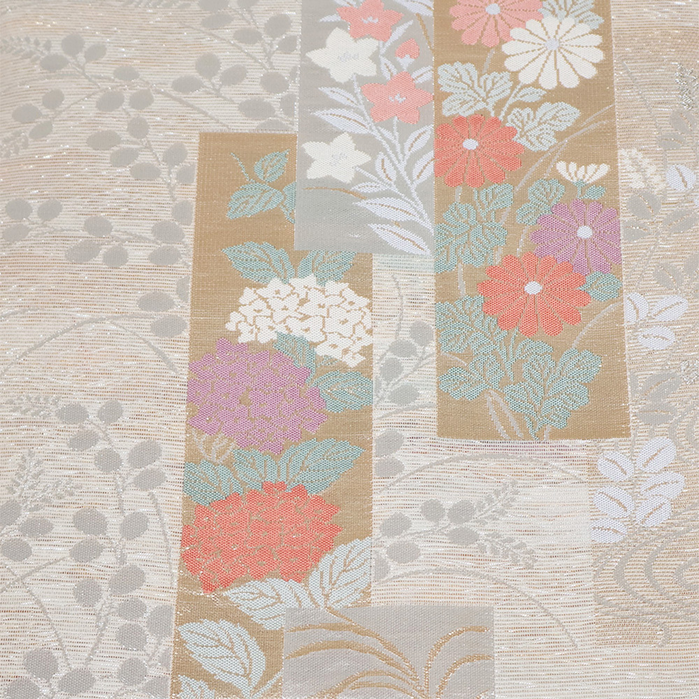 | 紗 西陣織袋帯 ベージュ・金箔・銀箔地 短冊文 菊・桔梗・南天・紫陽花 未使用品 仕立て上がり | |