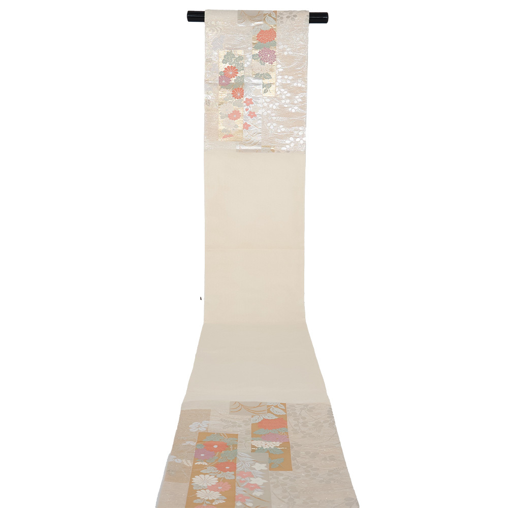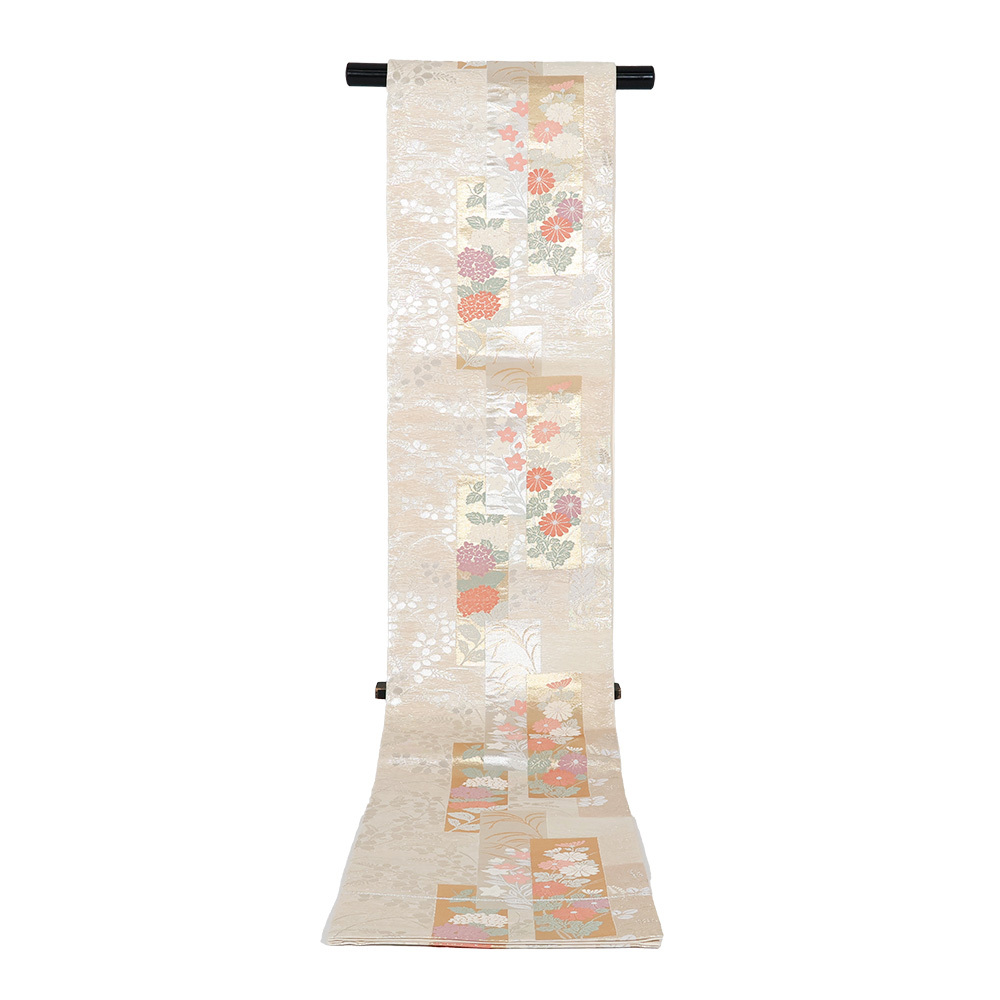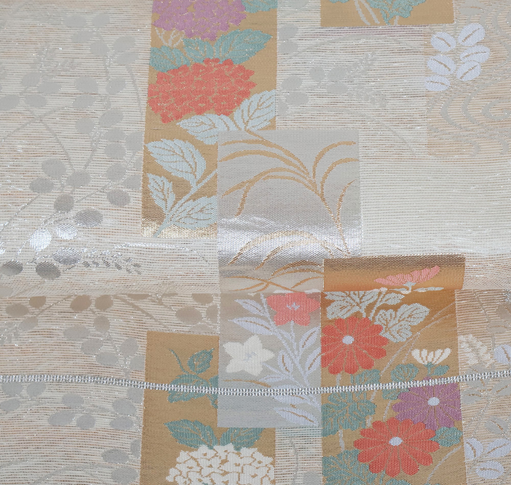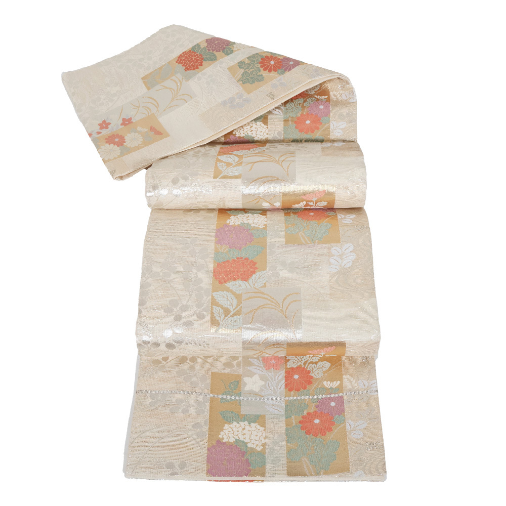 | 紗 西陣織袋帯 ベージュ・金箔・銀箔地 短冊文 菊・桔梗・南天・紫陽花 未使用品 仕立て上がり | |
