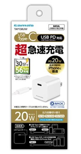 ■商品説明(製品の特徴)●USB PD(USB Power Delivery)に対応したAC充電器。●最大20Wの高出力でUSB PD対応機器を超急速充電。●過電流/過電圧保護機能を搭載した安全設計。●海外でも使用できるAC100V~240V対応。※国や地域によって市販の変換プラグが必要になる場合があります。■ポート:Type‐C(Power Delivery)×1■入力定格:AC100V~240V 50/60Hz 0.5A MAX■出力定格:DC5V 3A,9V 2.22A,12V 1.67A急速充電、海外OK■材質本体ケース:PCACプラグ:銅合金■サイズ●約W29.5×H30.5×D31.5mm(ACプラグ含まず)●質量:約36g