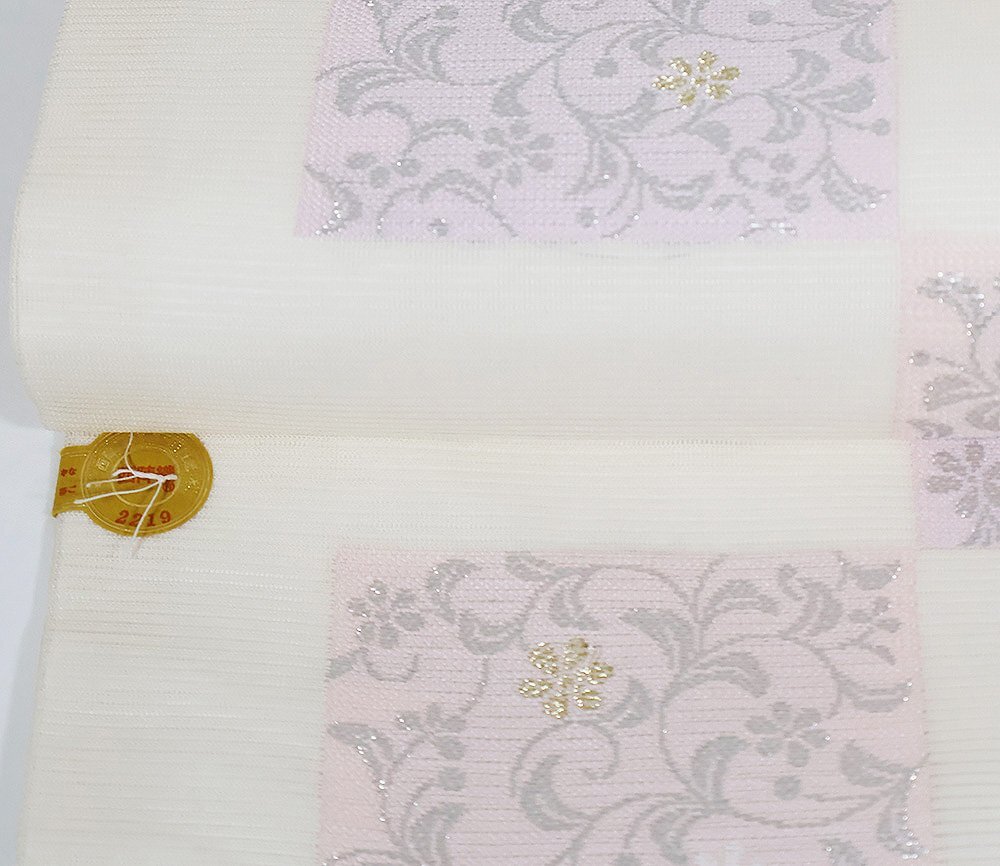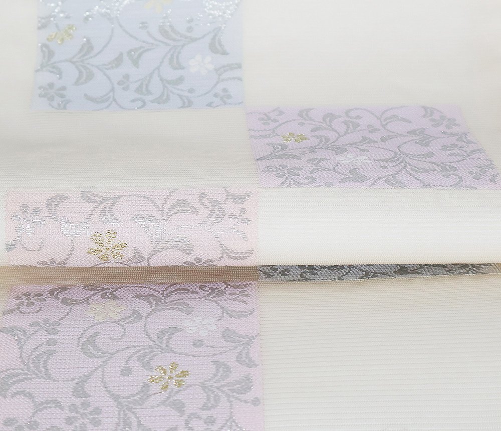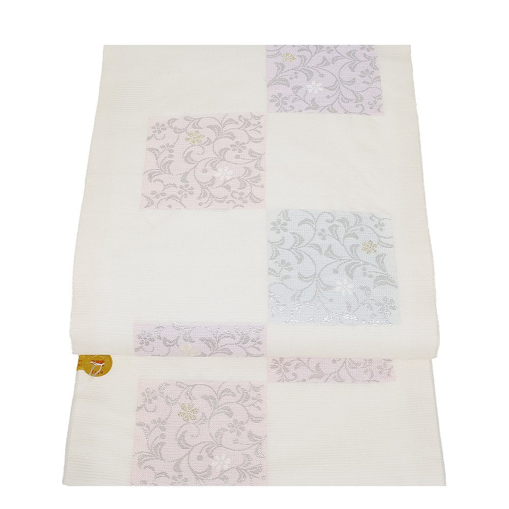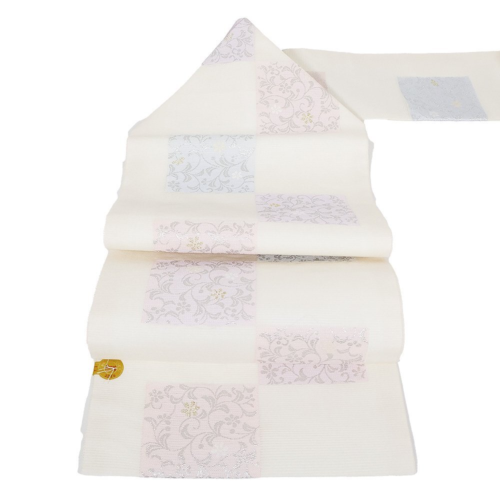 | 佐々木染織株式会社謹製 絽 西陣織名古屋帯 クリーム・薄紫・ピンク・金・銀地 縫い取り・唐花・格子縞 新品 仕立て上がり 日本製 | |