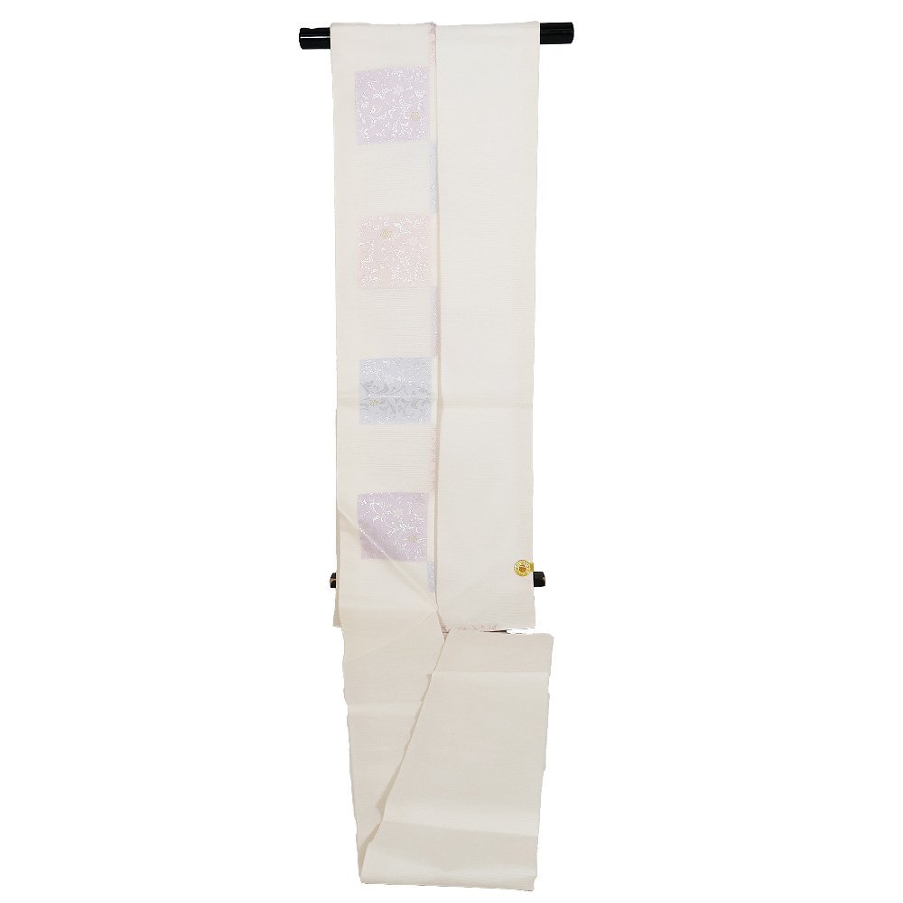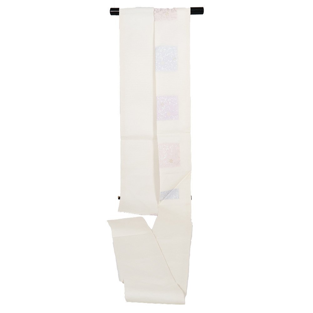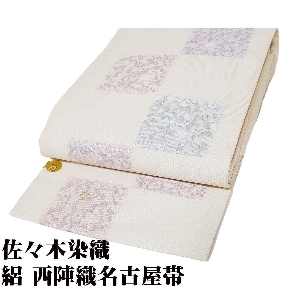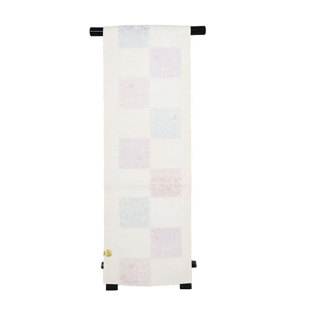 | 佐々木染織株式会社謹製 絽 西陣織名古屋帯 クリーム・薄紫・ピンク・金・銀地 縫い取り・唐花・格子縞 新品 仕立て上がり 日本製 | |