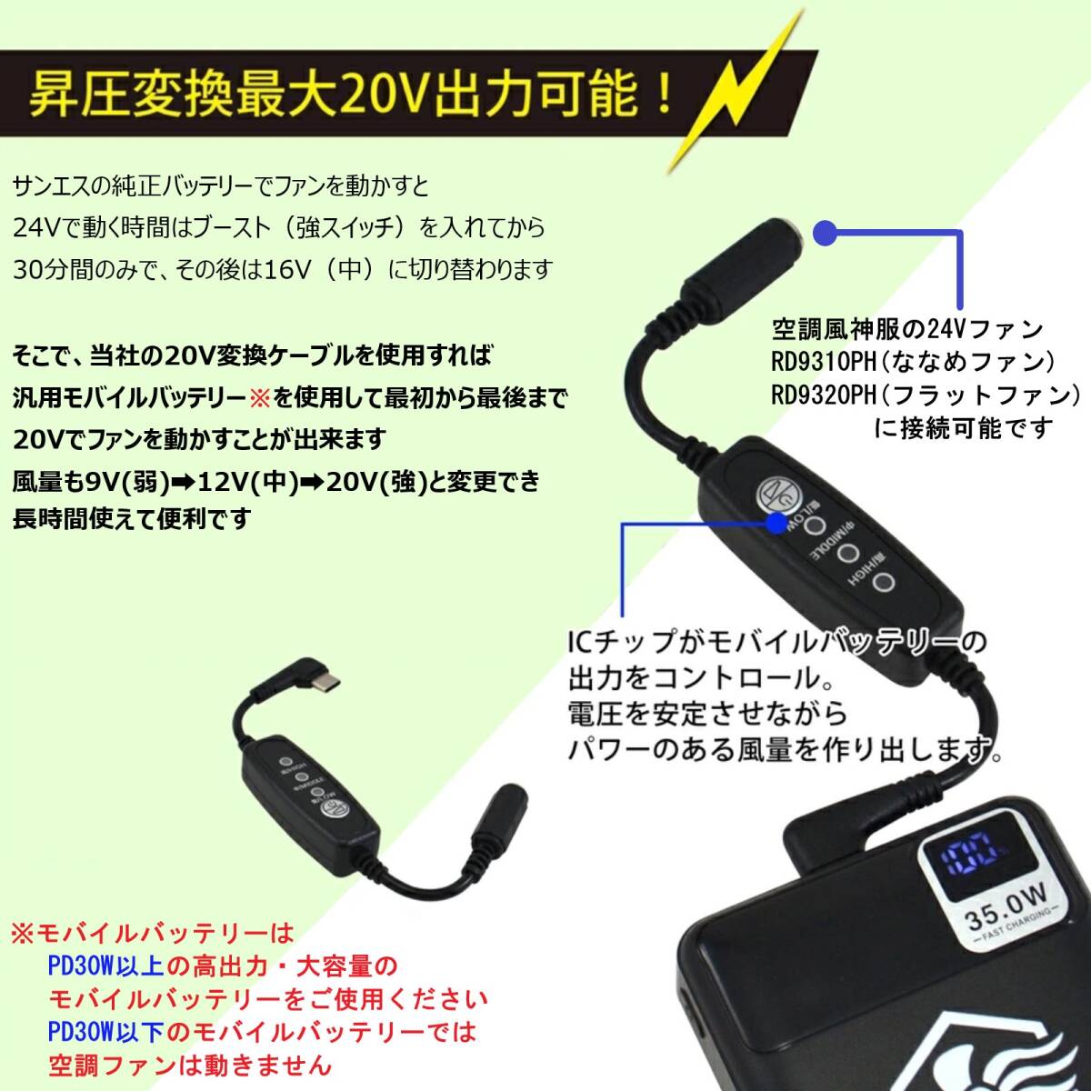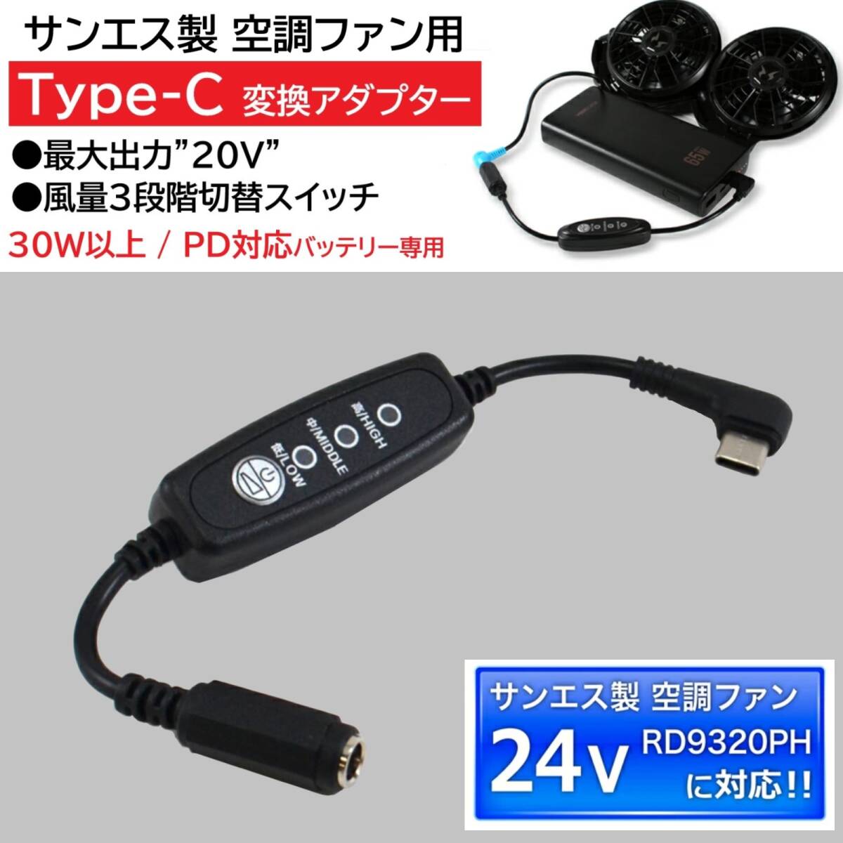 空調風神服 RD9310PH ななめ型ファン 専用 タイプC変換ケーブル 最大20V出力 風量3段階切替 PD30W以上バッテリー専用 空調服 【20V-D】 ②