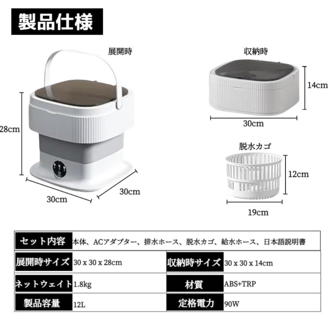 【製品仕様】電源コード式、電源:AC100-220V 50Hz、最大使用水量:約12L。収納時サイズ:30 x 30 x 14cm/展開時サイズ:30 x 30 x 28cm。重量:約1.8kg。付属品:排水ホース、脱水カゴ、給水ホース、日本語取扱説明書。