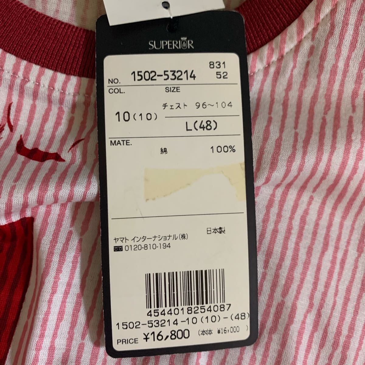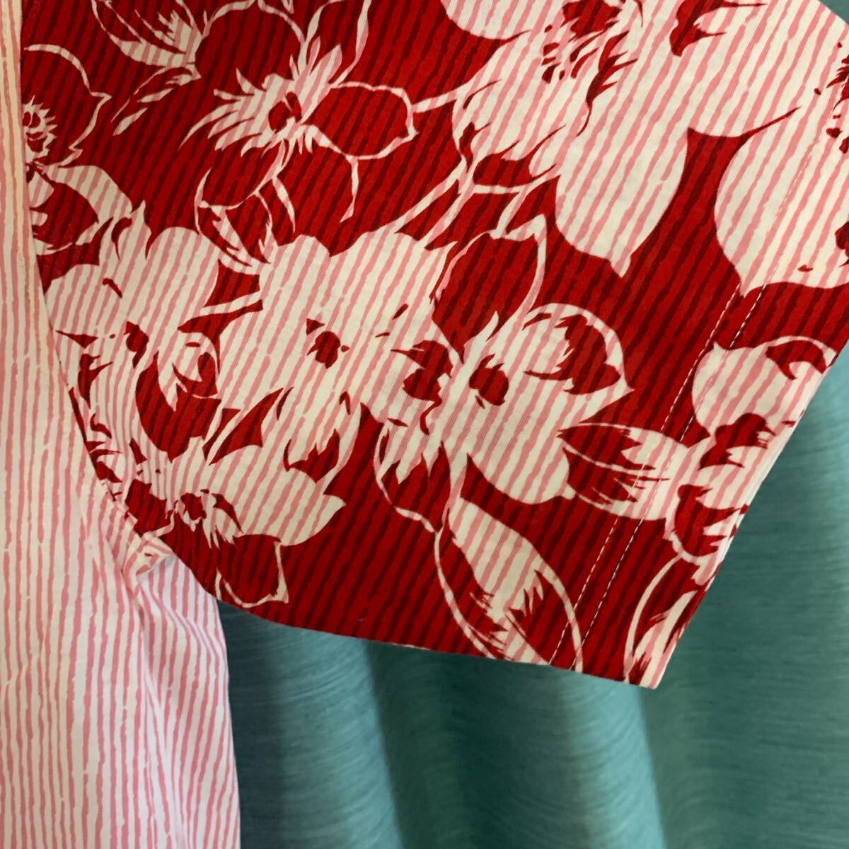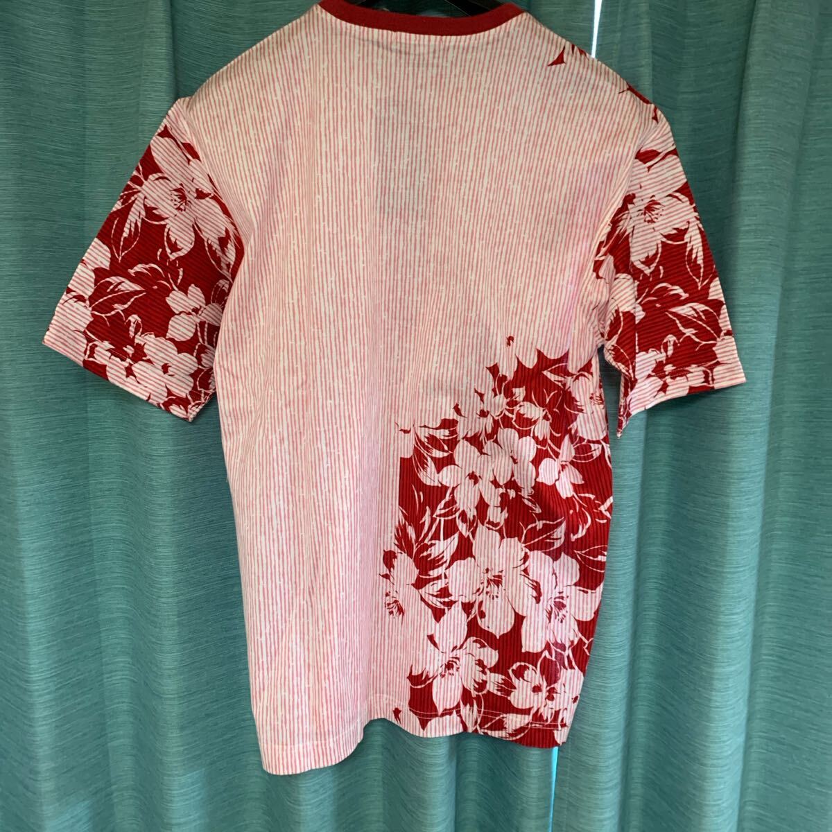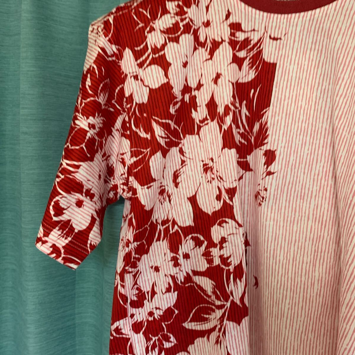 赤と白の花柄とストライプのユニークなデザインのTシャツ。