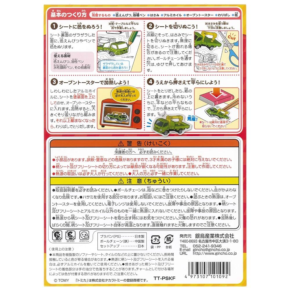 「商品情報」トミカの人気な乗り物がプリントされたプラバンです。お好きな色を塗るだけなので、お子様でも簡単に作っていただけます。お好きな色をぬって自分だけのトミカを作ってみよう! ※トースターで焼くと約5分の一に縮みます。※大人の方と必ず一緒に作業してください。品番:TT-PSKF仕様:トミカセット内容:プラバン柄シート3枚、フリーシート1枚、ボールチェーン2個柄:ショベルカー「主な仕様」パッケージサイズ:H209×W137×D2mm材質:プラバン/OPS、ボールチェーン/鉄セット内容:ハガキサイズプラバン4枚(柄付き3枚、柄なし1枚)、ボールチェーン2個◯対象年令:6才以上 ◯MADE IN JAPAN(日本製)◯銀鳥産業