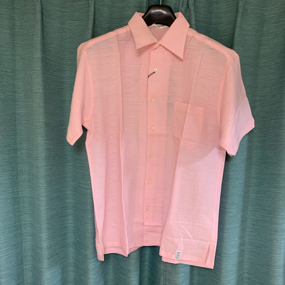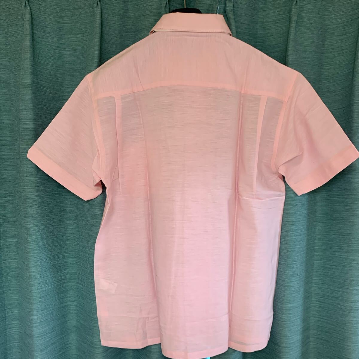 ポリエステルと綿の混合素材で、軽やかな着心地のピンクの半袖シャツです。