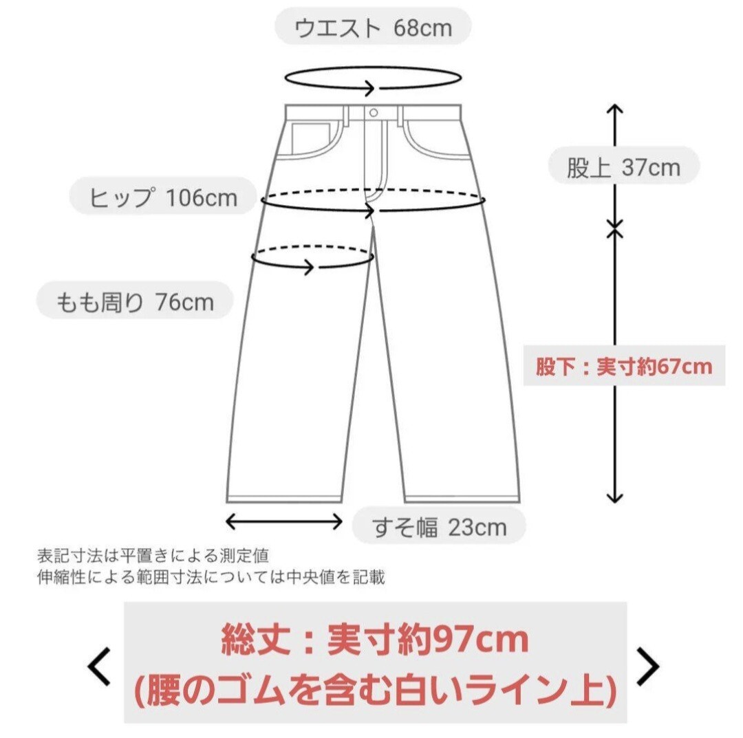 【総丈:実測約97cm(ウエストのゴム含む白いライン上で測定)、股下:実測約67cm(元々メーカー値76cmを腰履きするために8cm裾上げ)、ウエスト:68cm(ゴムなので90cm以上でも大丈夫だと思います)】