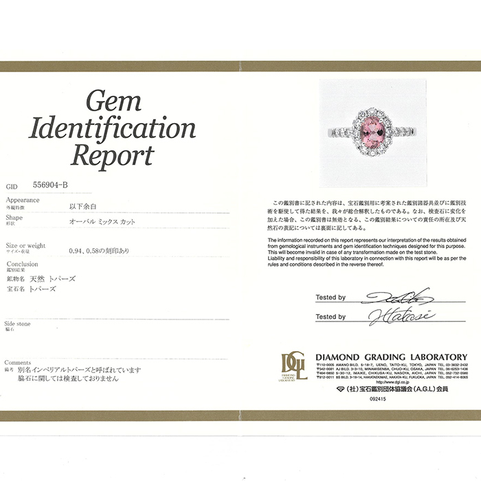 | 石目 | インペリアルトパーズ:0.94ct / ダイヤモンド:0.58ct |