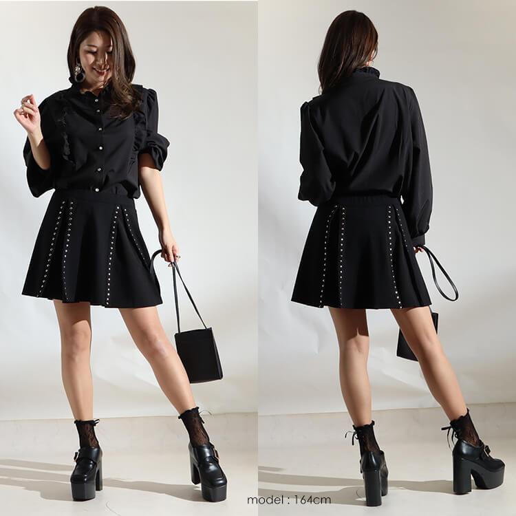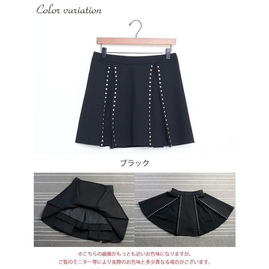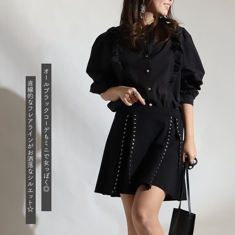 シンプルなブラックのプリーツスカートに、縦にならんだたくさんのスタッズが高見えするデザインです。