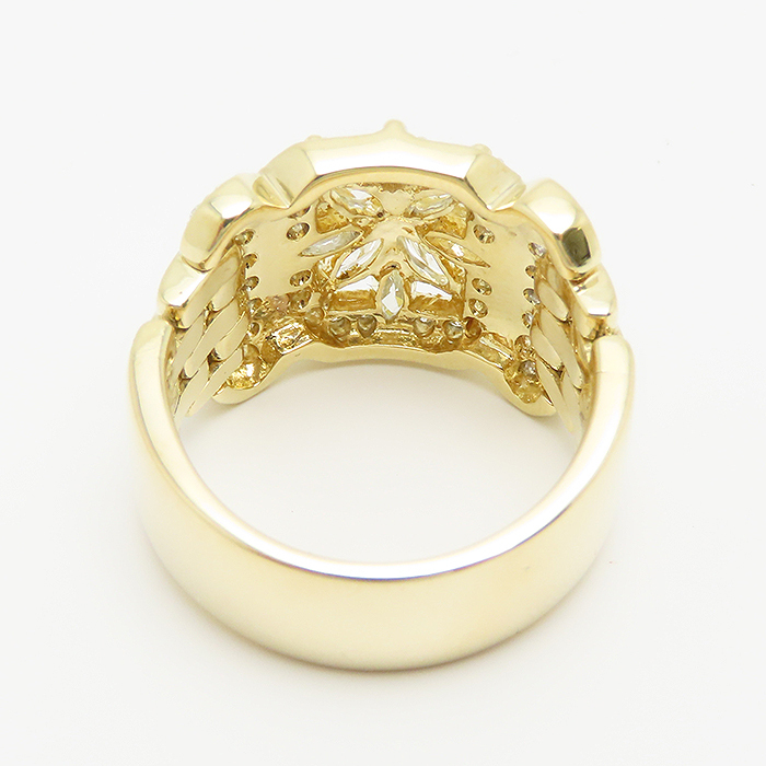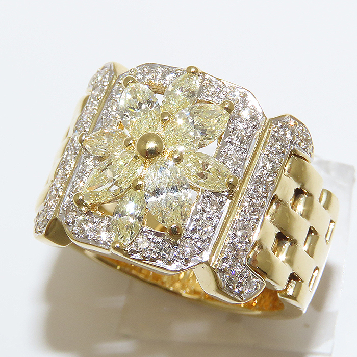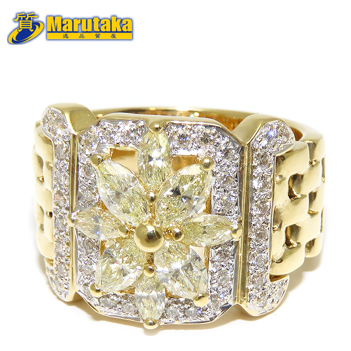 商品説明 | しっかりとしたイエローゴールドの台に、マーキスダイヤとメレダイヤをゴージャスにセッティングしたリングです。 |