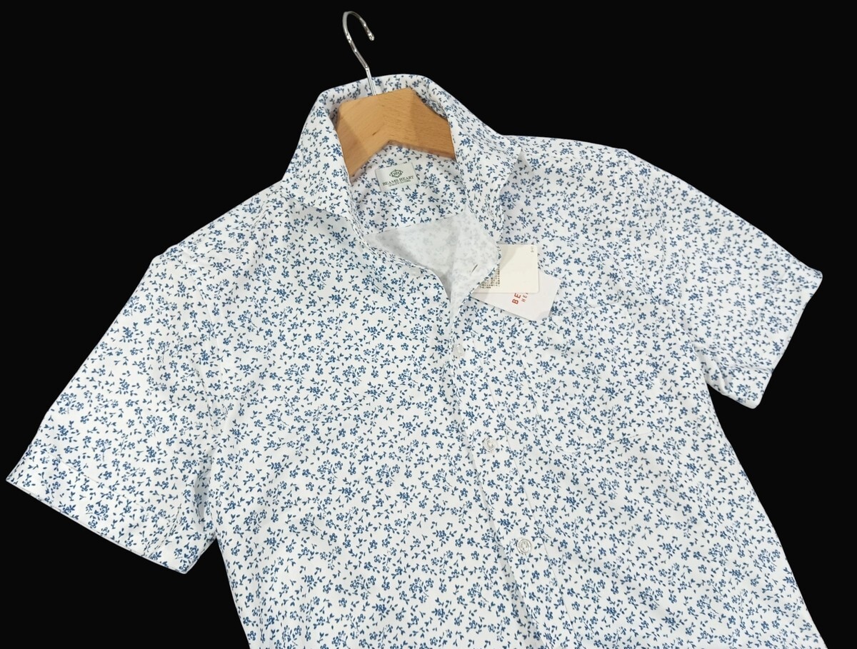 ●清涼感のある肌触りのポリエステル鹿の子素材にオリジナルの小花柄フラワープリントを施した半袖シャツです。