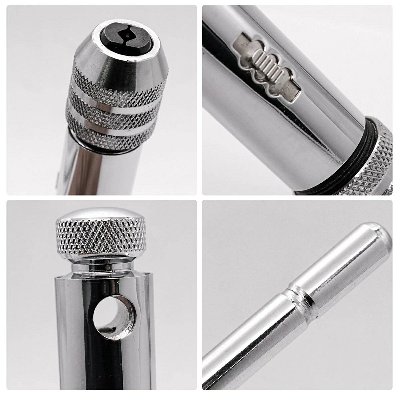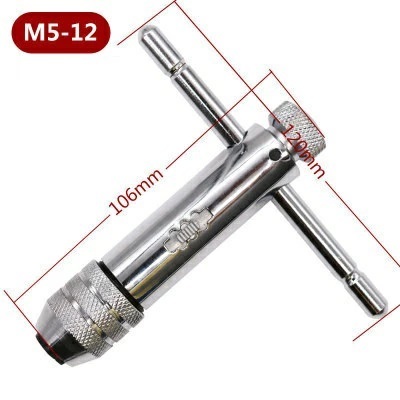 ラチェット機構を搭載したT型タップホルダー、回転方向の切替が可能で、上部ハンドルは、スライドさせての使用ができる。