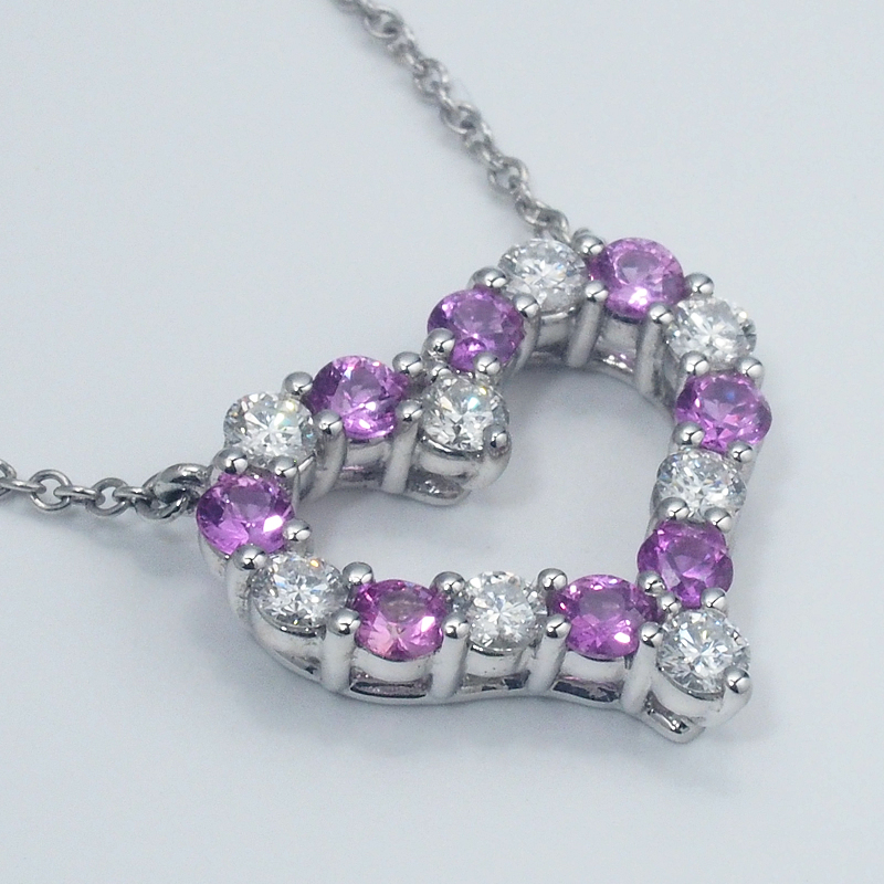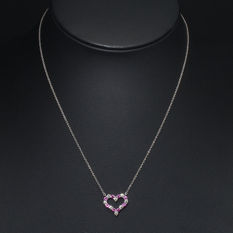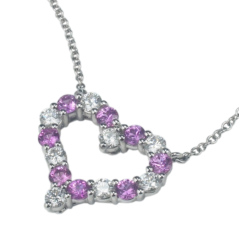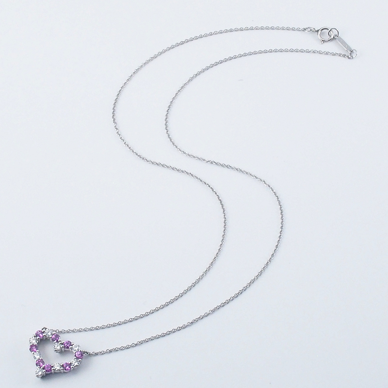 ハートデザイントップにピンクサファイアとダイヤモンドをセッティングした、ティファニーのプラチナ製「センチメンタルハート」ネックレスです。