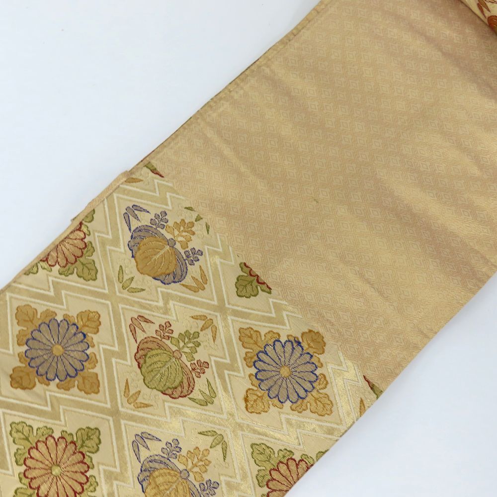 中古 袋帯 正絹(金銀糸除く) ゴールド マルチカラー 六通柄 入子菱に菊模様 フォーマル 和装 呉服 和服 きもの レディース 女性
