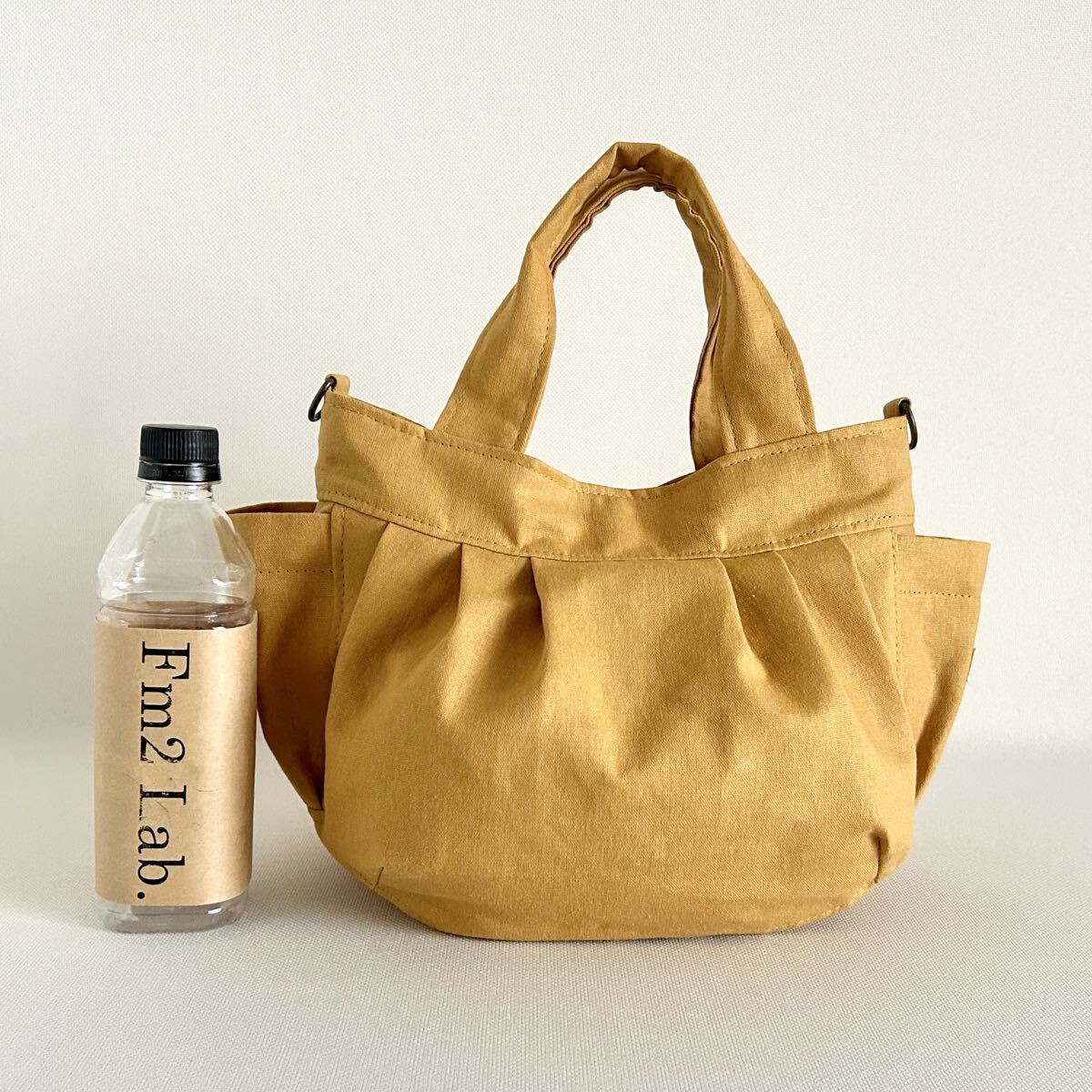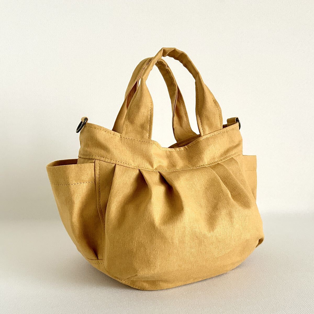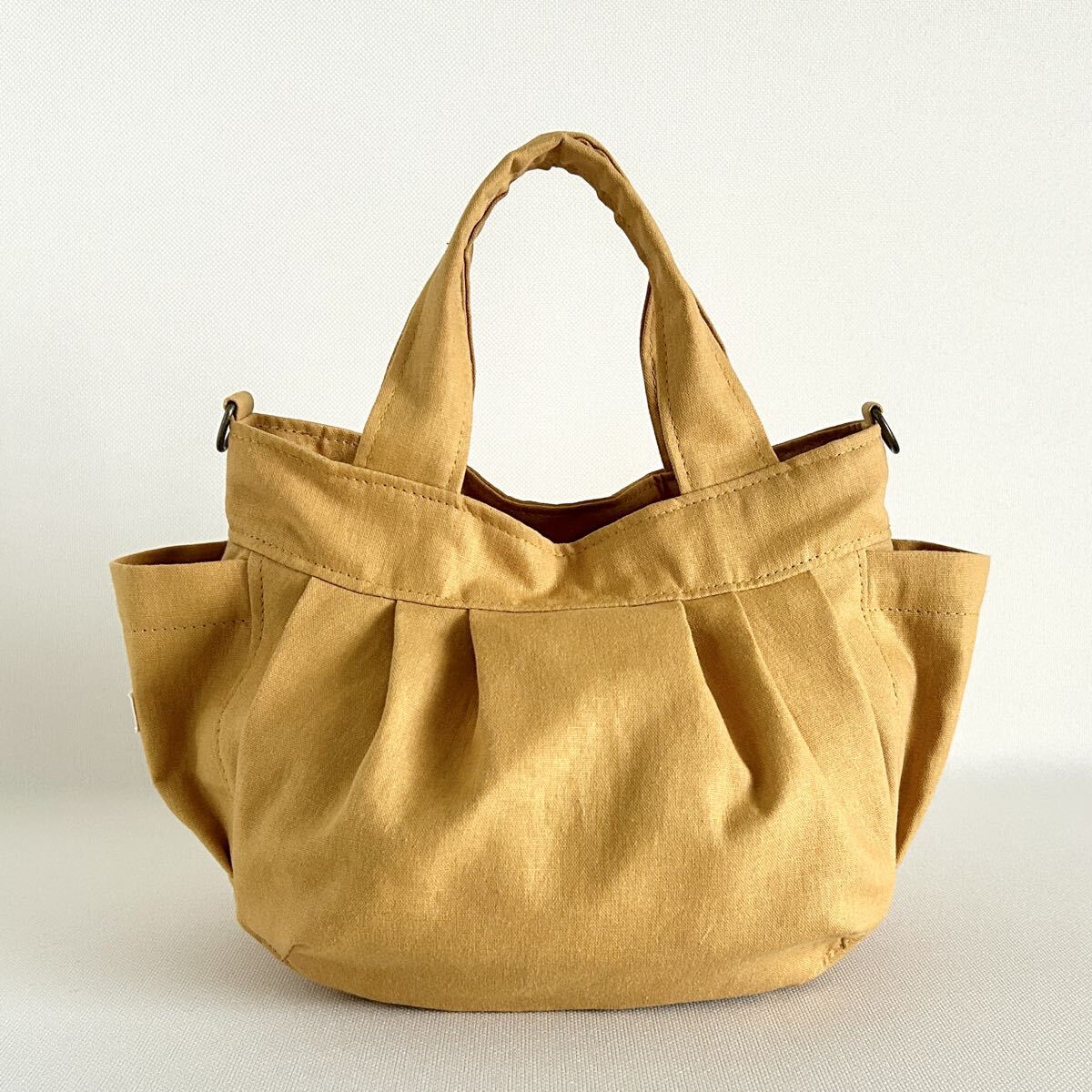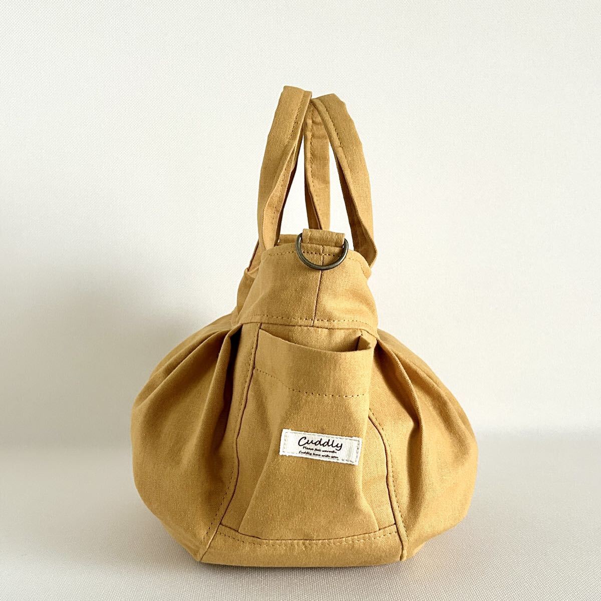 即決 ハンドメイド Sサイズ マスタード色 無地生地 綿麻 キャンバス ころりんバッグ♪