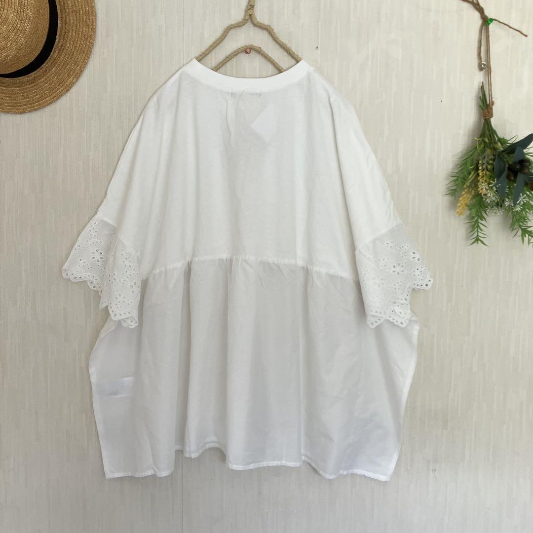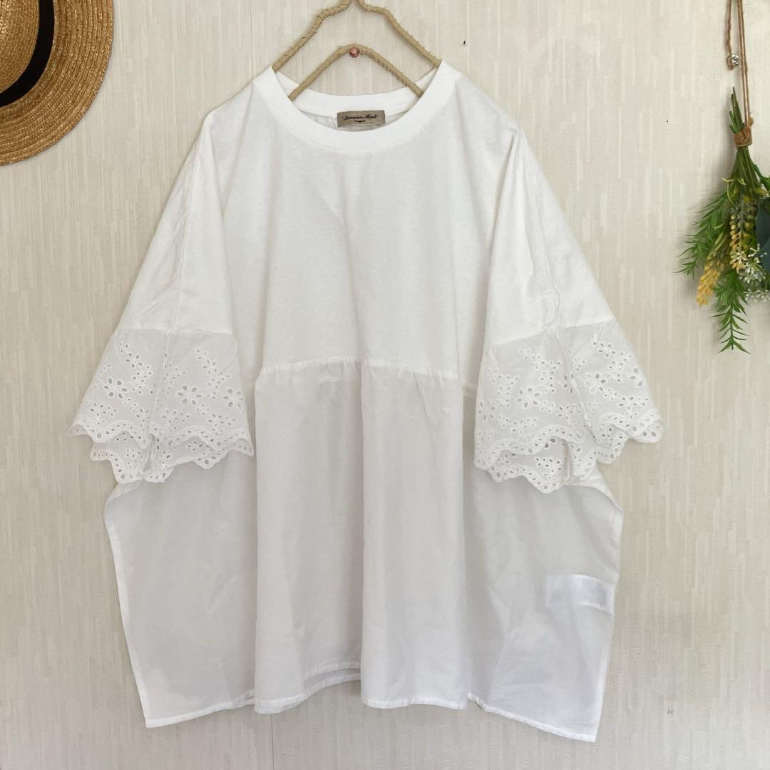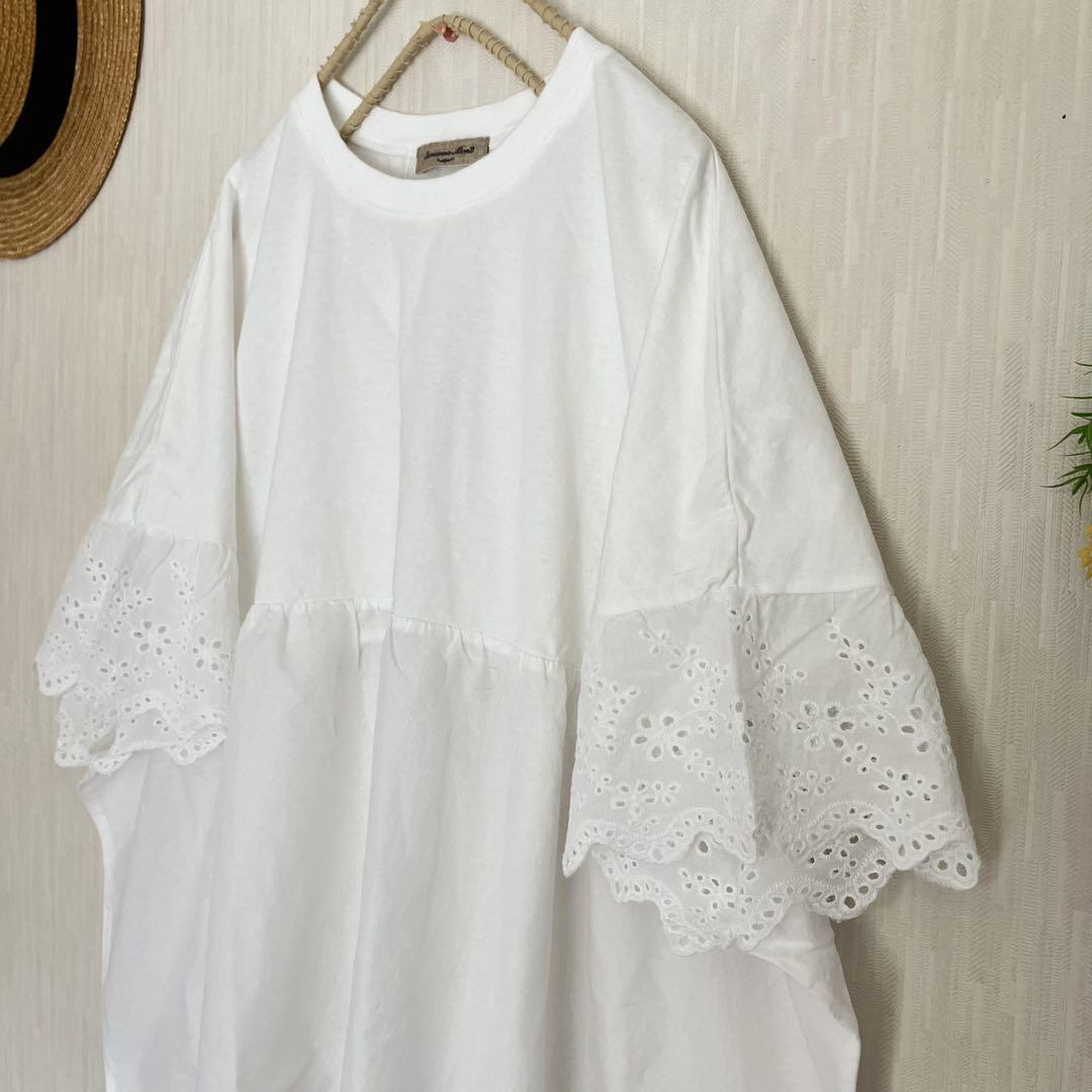 お袖の先のスカラップレースが可愛らしいゆったり身幅のカットソーです。