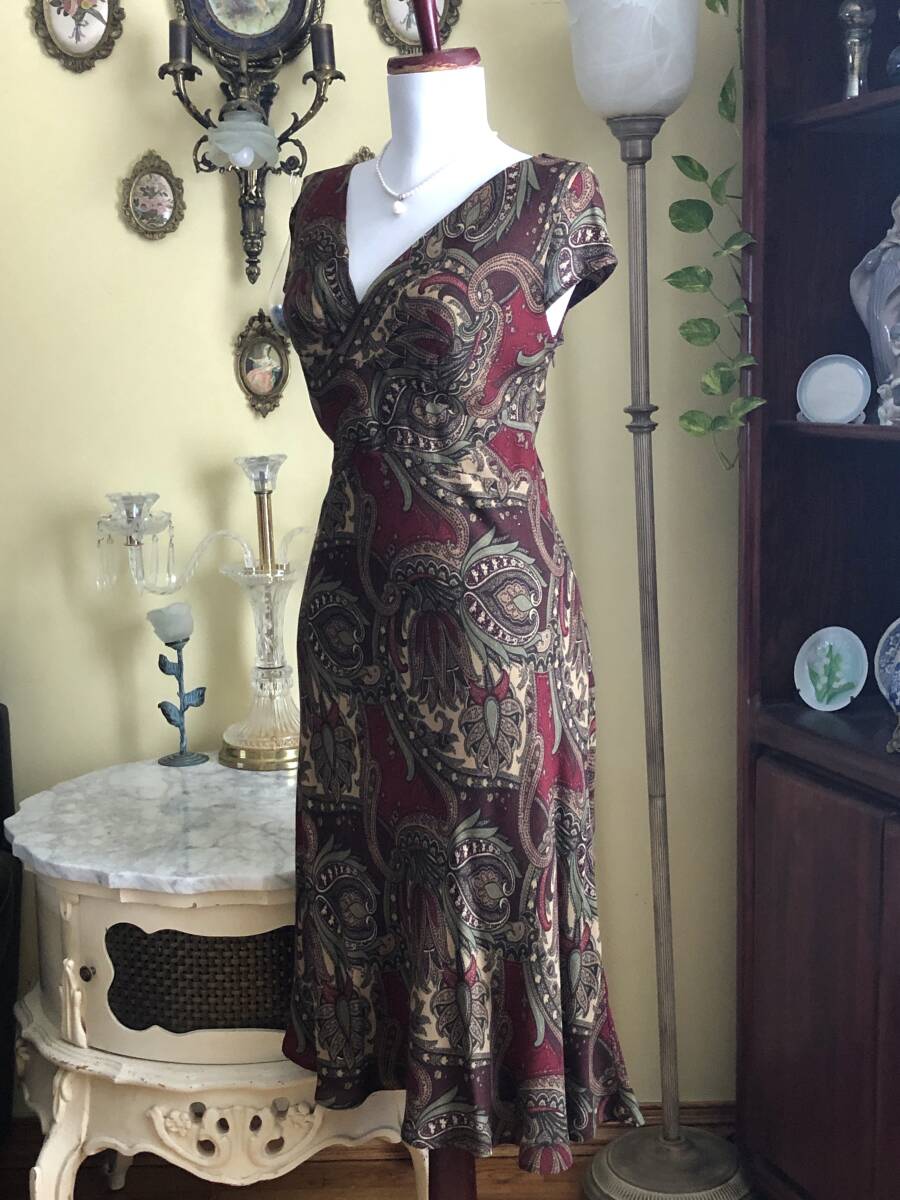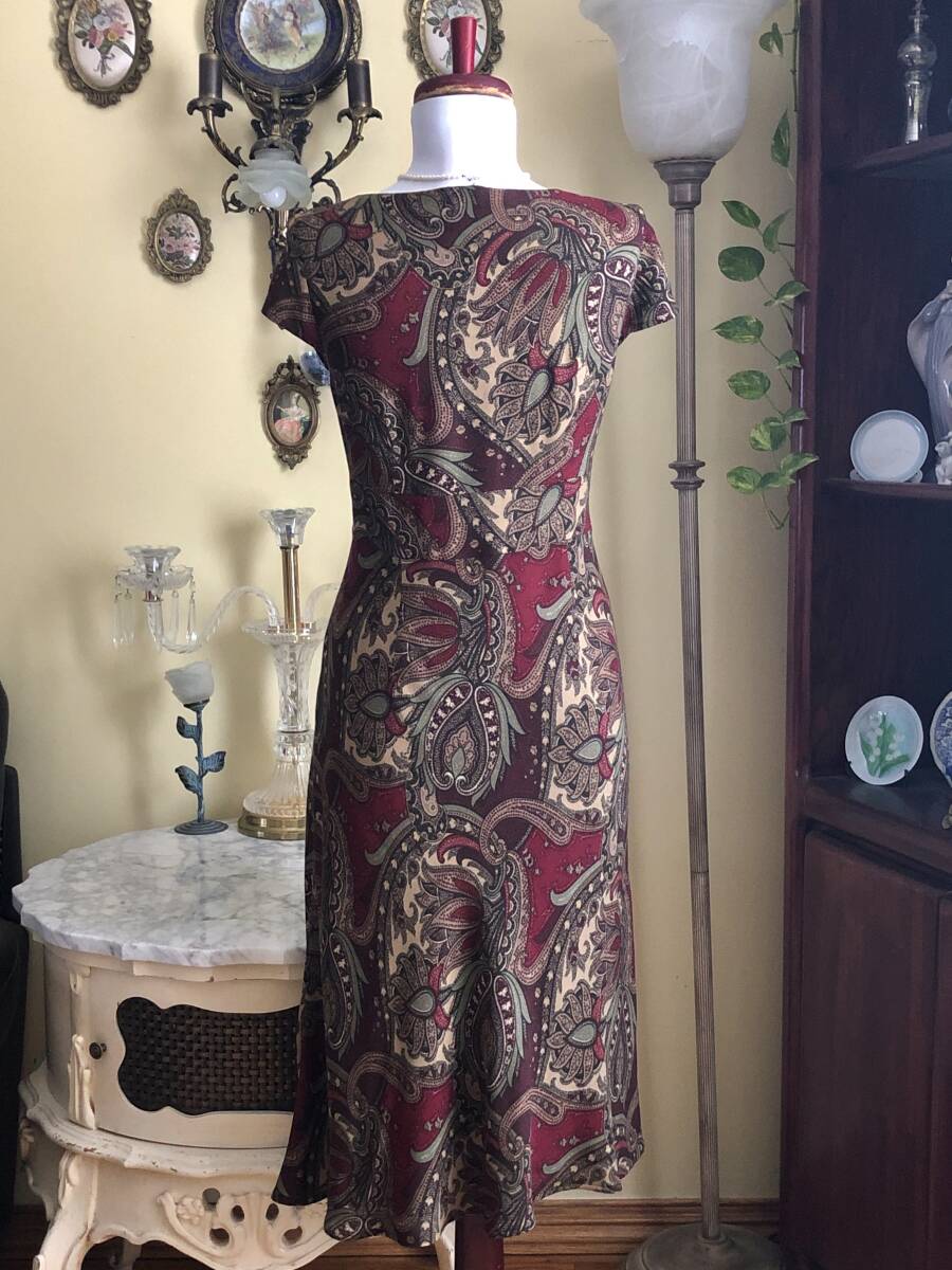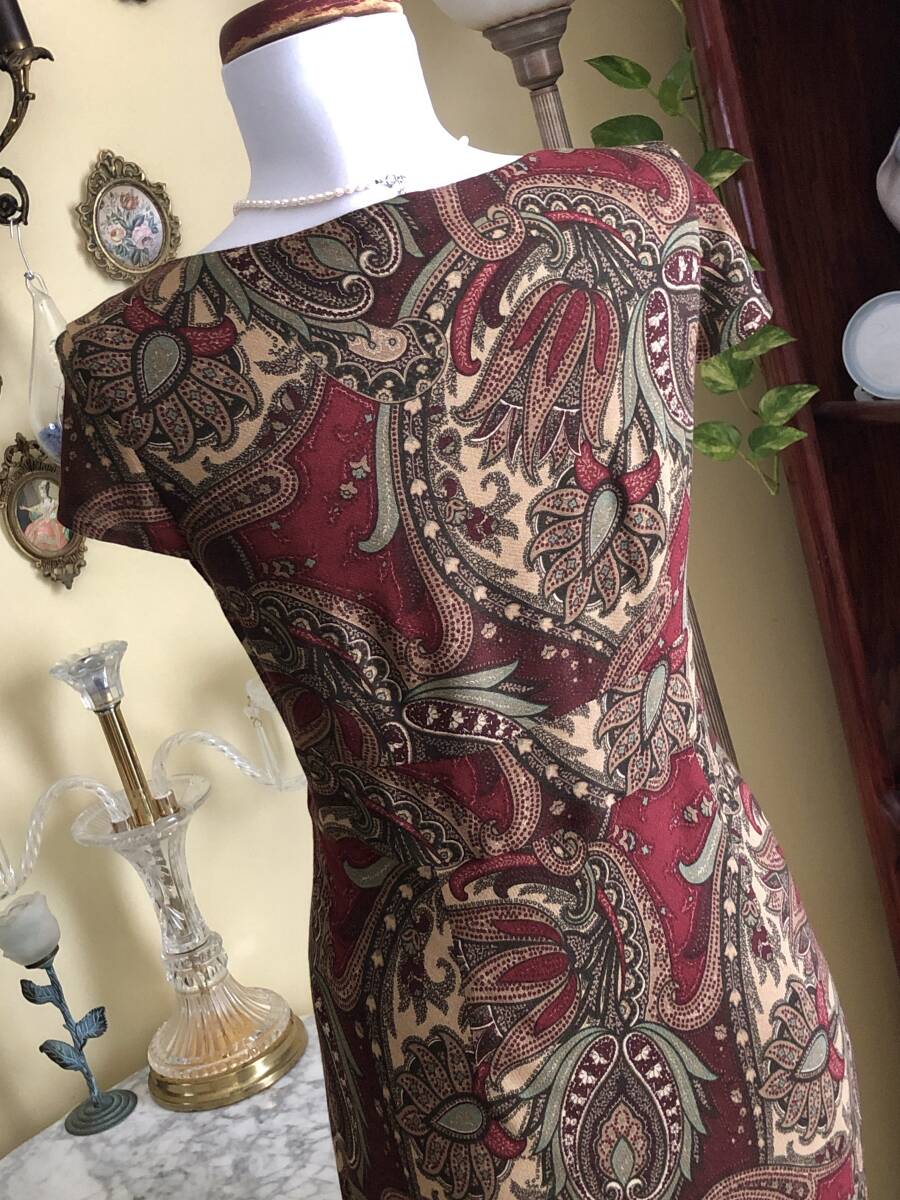 【LOFT】より、素敵なカクテルドレスです。 ワイン地にシックなペイズリー柄が綺麗です。 お胸の下からウエストにかけてベルト切り替えが入っています。 裾に少しフレアーが入ったマーメイドスカートです。 ウールを少し含んだマットで柔らかなレーヨン素材です。 ストレッチスムース素材の裏地が付いています。 左脇ファスナーで開きます。 【状態】中古 大変綺麗な状態のお品です。 【ブランド】LOFT 【サイズ】表示サイズ/ US(アメリカ)4 日本対応サイズ目安/ 9号Mサイズぐらい *個人差がございます。必ず採寸をご参照ください。 【採寸】平置き採寸です。 肩幅38㎝、身幅46cm、ウエスト40cm、着丈108cm(上身丈32㎝+切り替え幅後6㎝+スカート丈70㎝) *ストレッチします 【カラー】ワイン地 【素材】レーヨン96%、ウール4% 【裏地の素材】ポリエステル100% 【着脱】脇ファスナー |