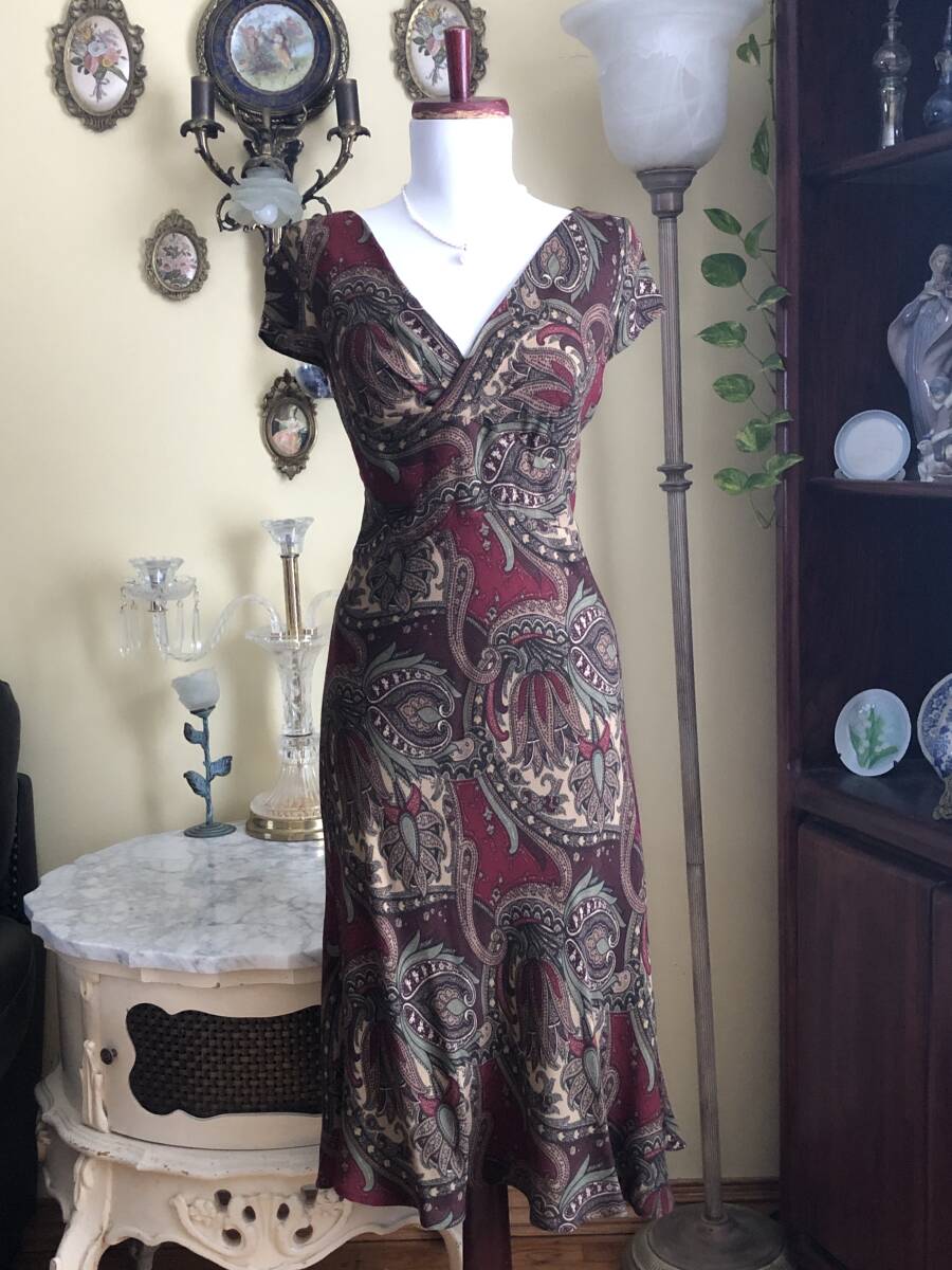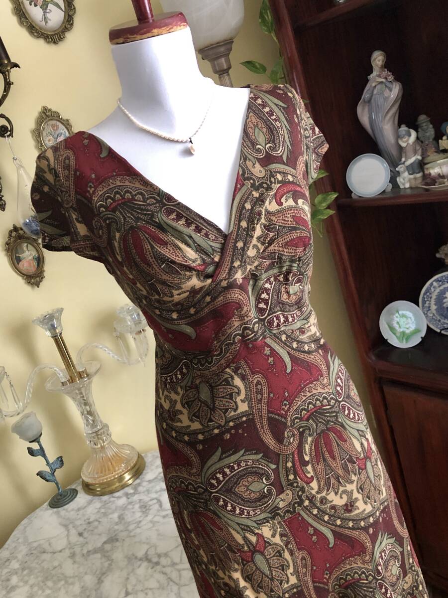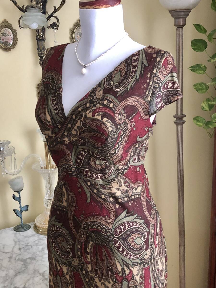 【LOFT】より、素敵なカクテルドレスです。 ワイン地にシックなペイズリー柄が綺麗です。 お胸の下からウエストにかけてベルト切り替えが入っています。 裾に少しフレアーが入ったマーメイドスカートです。 ウールを少し含んだマットで柔らかなレーヨン素材です。 ストレッチスムース素材の裏地が付いています。 左脇ファスナーで開きます。 【状態】中古 大変綺麗な状態のお品です。 【ブランド】LOFT 【サイズ】表示サイズ/ US(アメリカ)4 日本対応サイズ目安/ 9号Mサイズぐらい *個人差がございます。必ず採寸をご参照ください。 【採寸】平置き採寸です。 肩幅38㎝、身幅46cm、ウエスト40cm、着丈108cm(上身丈32㎝+切り替え幅後6㎝+スカート丈70㎝) *ストレッチします 【カラー】ワイン地 【素材】レーヨン96%、ウール4% 【裏地の素材】ポリエステル100% 【着脱】脇ファスナー |