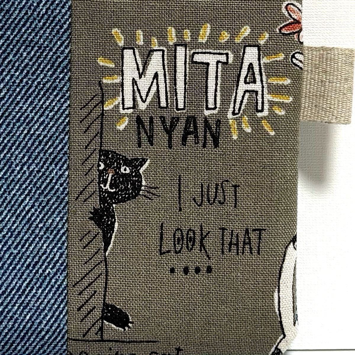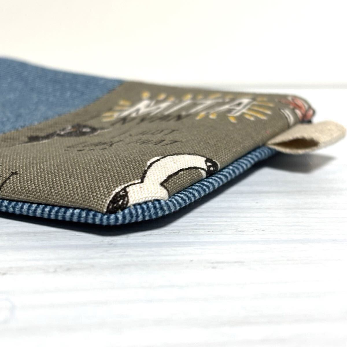 表面は猫柄とデニム調、裏側はデニム調、中はドット柄です。