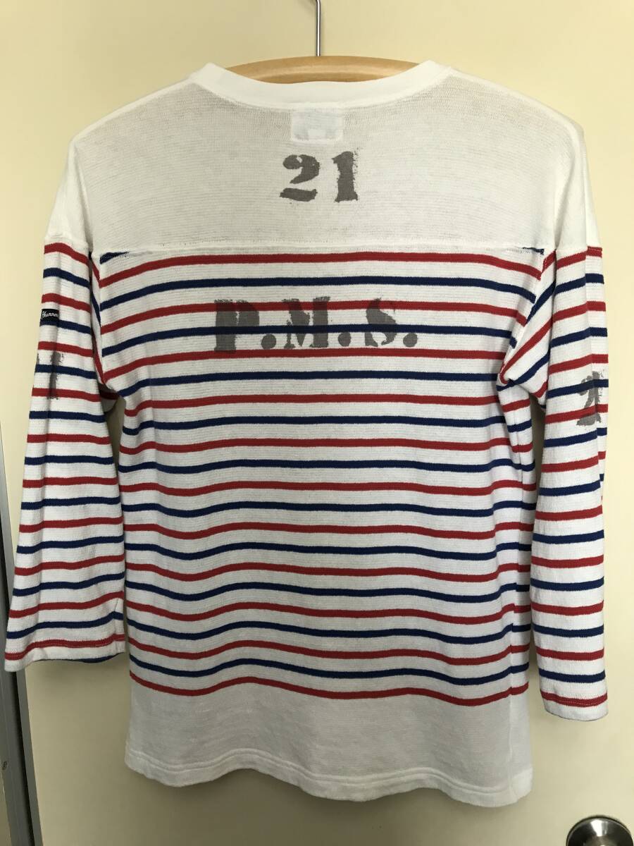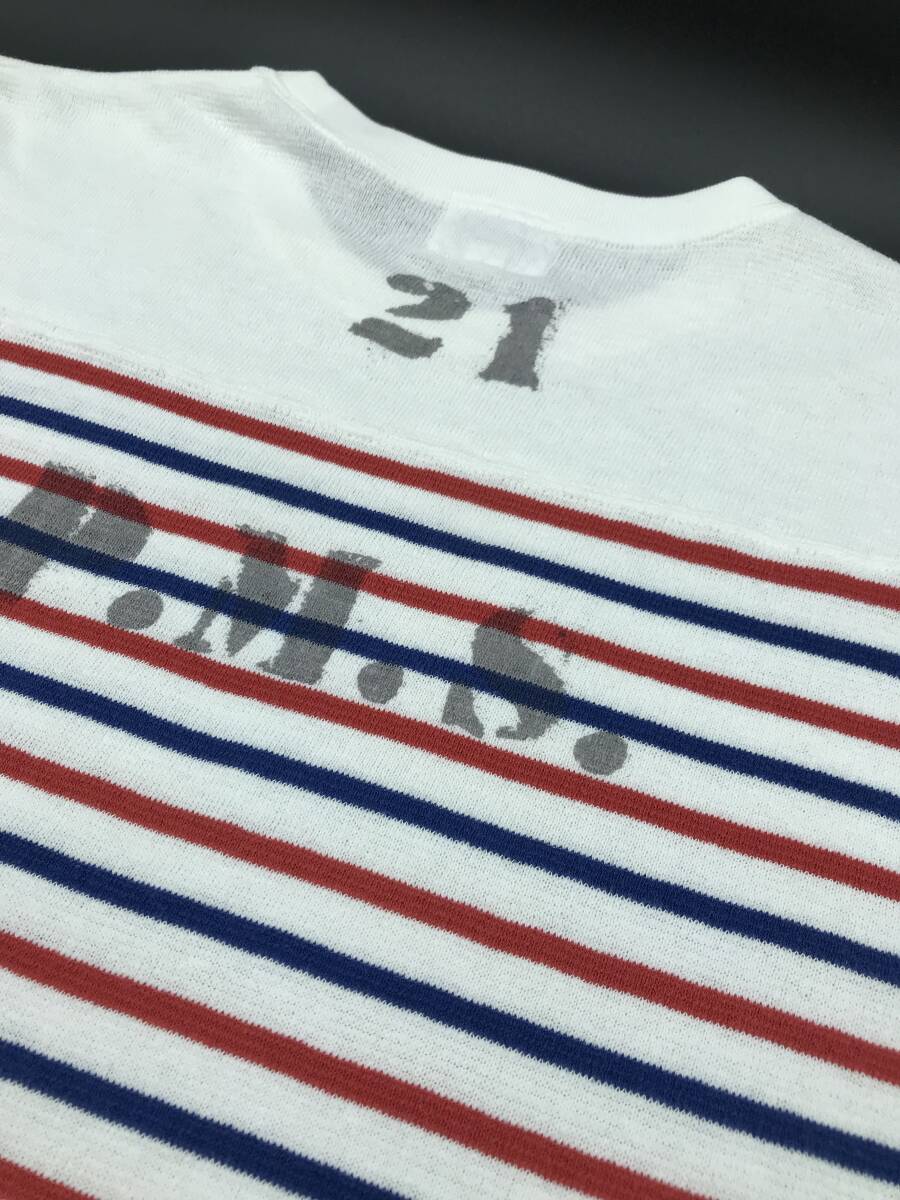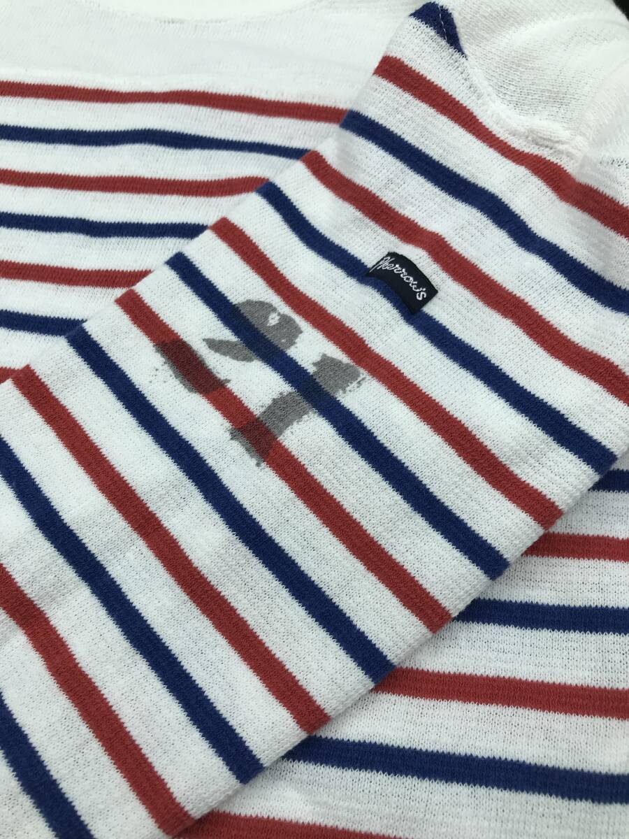 セントジェームスのナヴァルボーダーの様な海軍の制服をイメージした七分袖ボーダーに、ステンシルプリント、そして、生地は吸水性の高い、薄手のパイル(タオル)生地を使用したスペシャルな一着です。