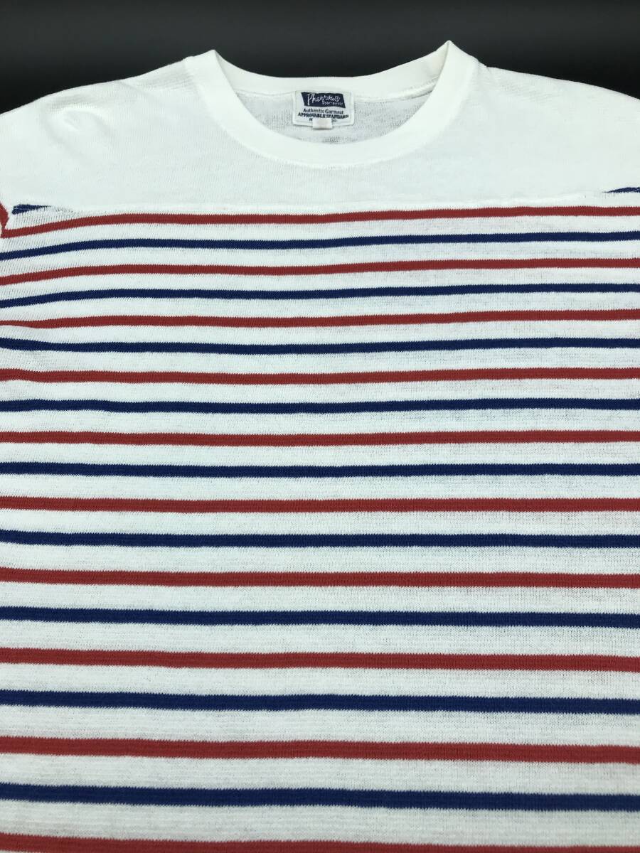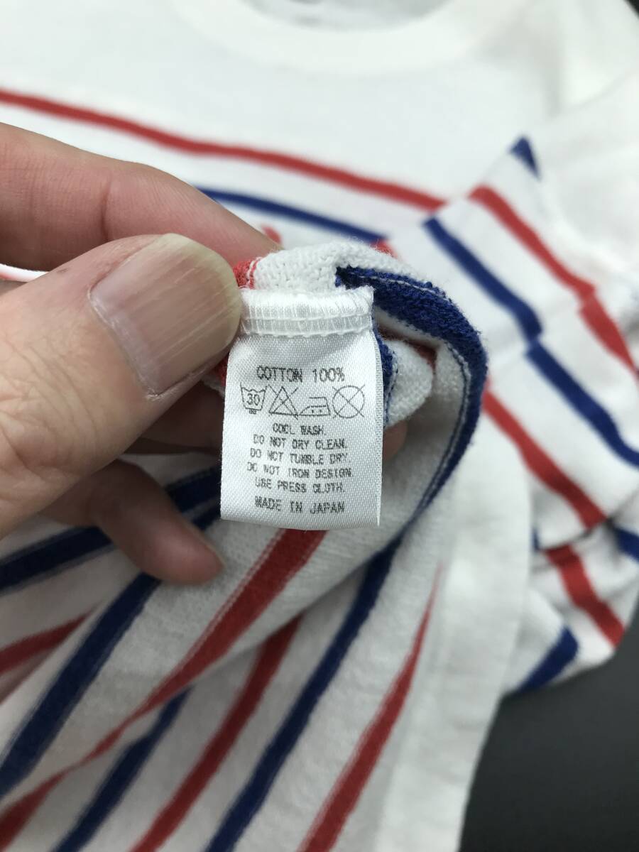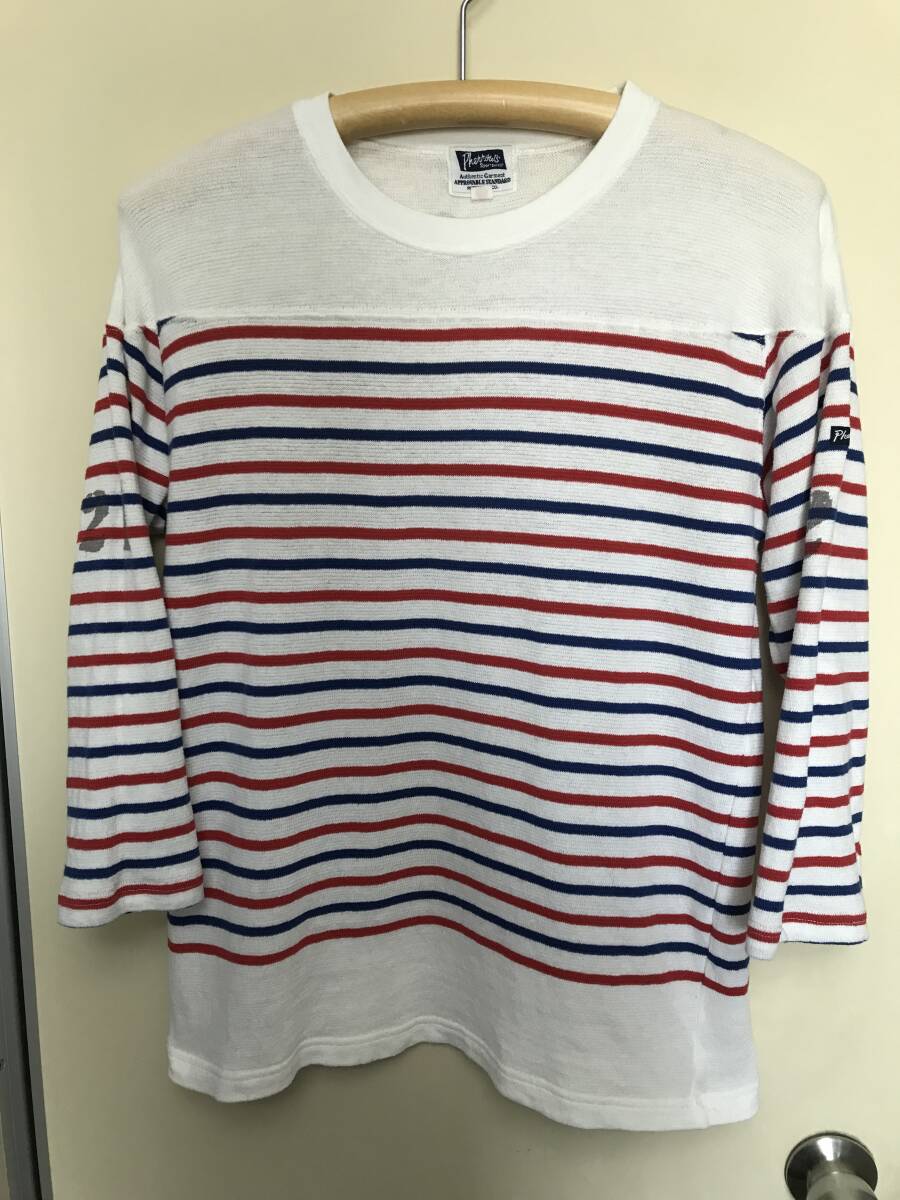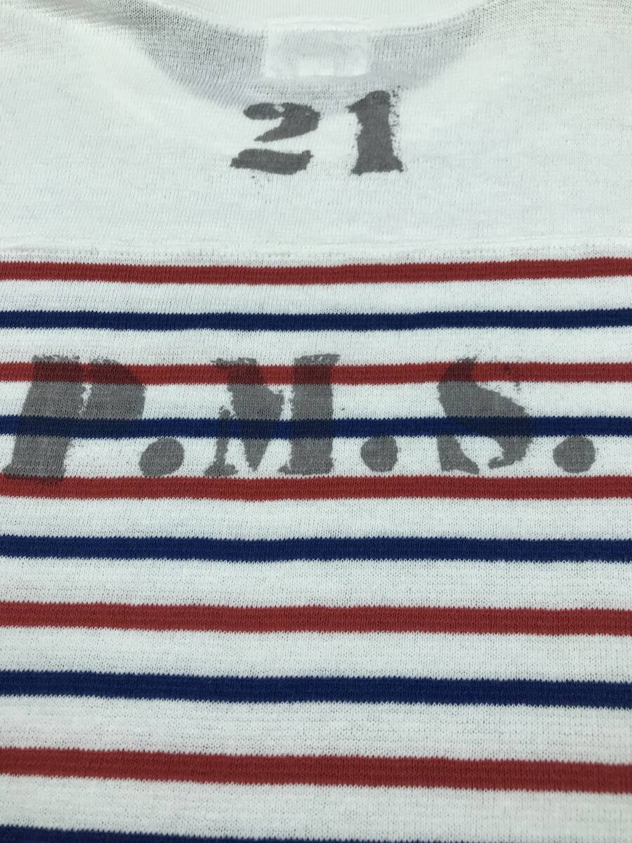 セントジェームスのナヴァルボーダーの様な海軍の制服をイメージした七分袖ボーダーに、ステンシルプリント、そして、生地は吸水性の高い、薄手のパイル(タオル)生地を使用したスペシャルな一着です。