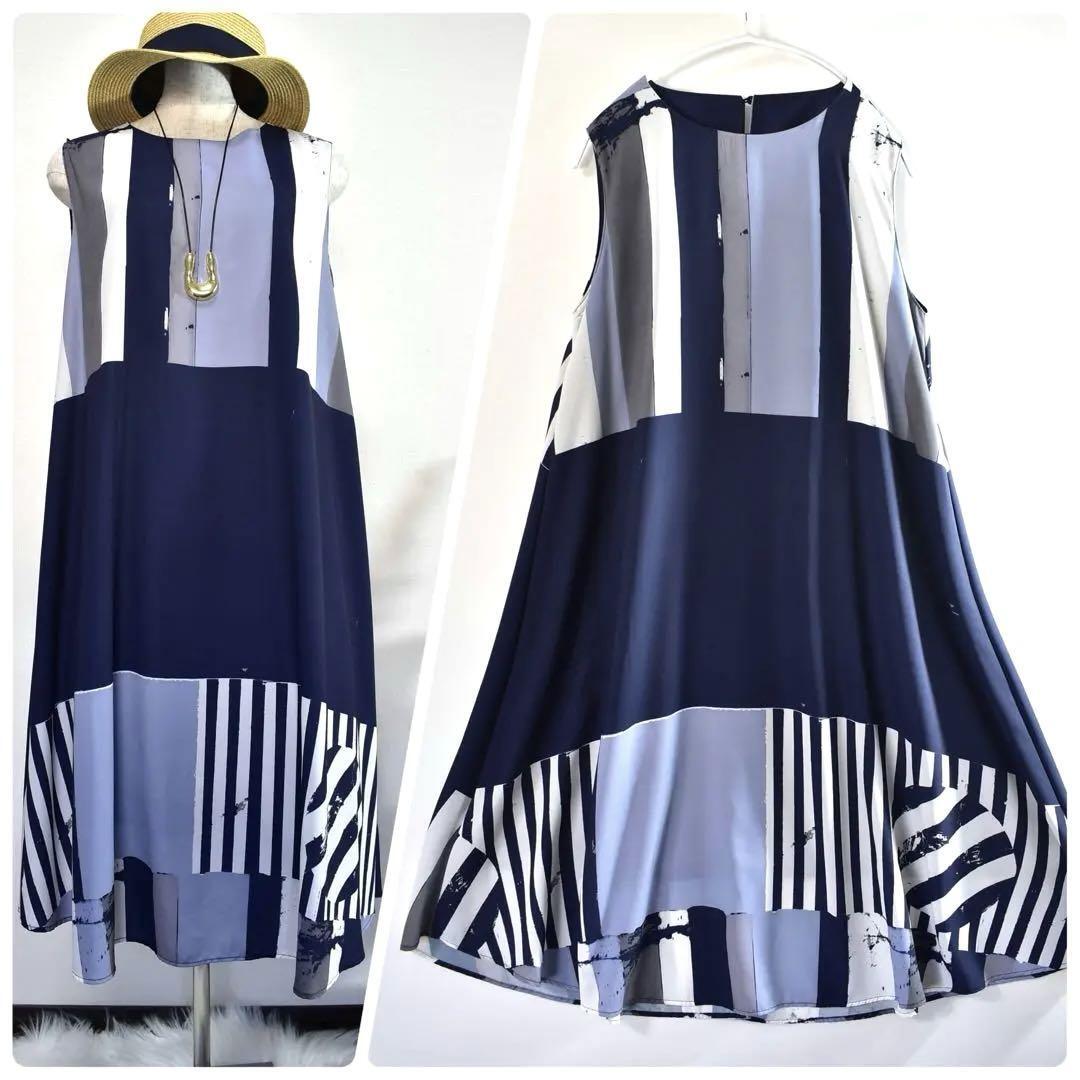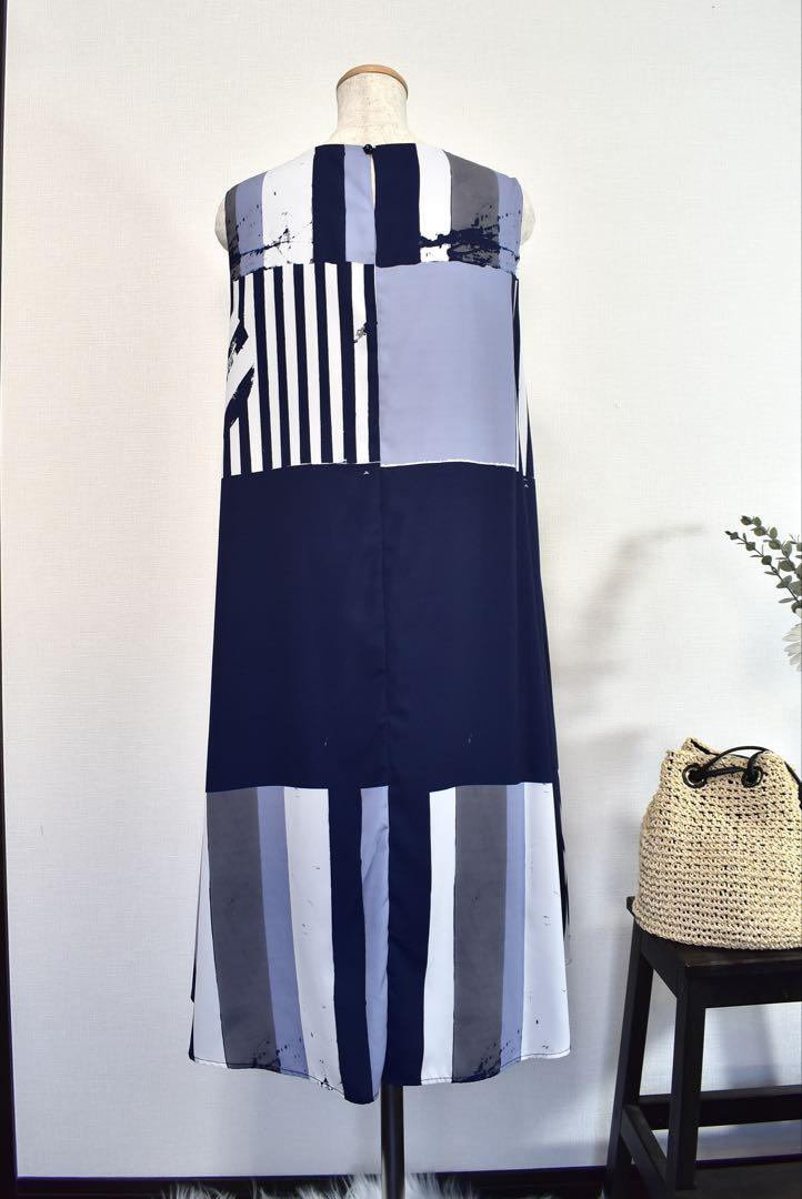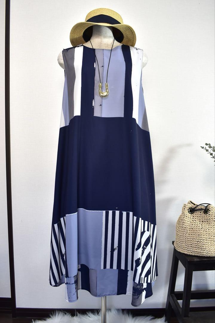 ガーランドフェリス 幾何柄ボーダーロングワンピース大人女子ブルー系