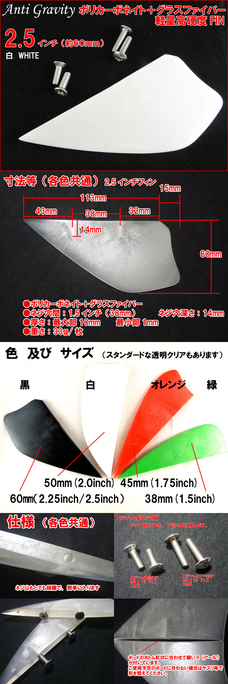 【Anti Gravity】 フィン 白 ホワイト 2.5インチ 1枚 カラフル カイトボード カイトボーディング カイトサーフィン ウエイクボード n2ik