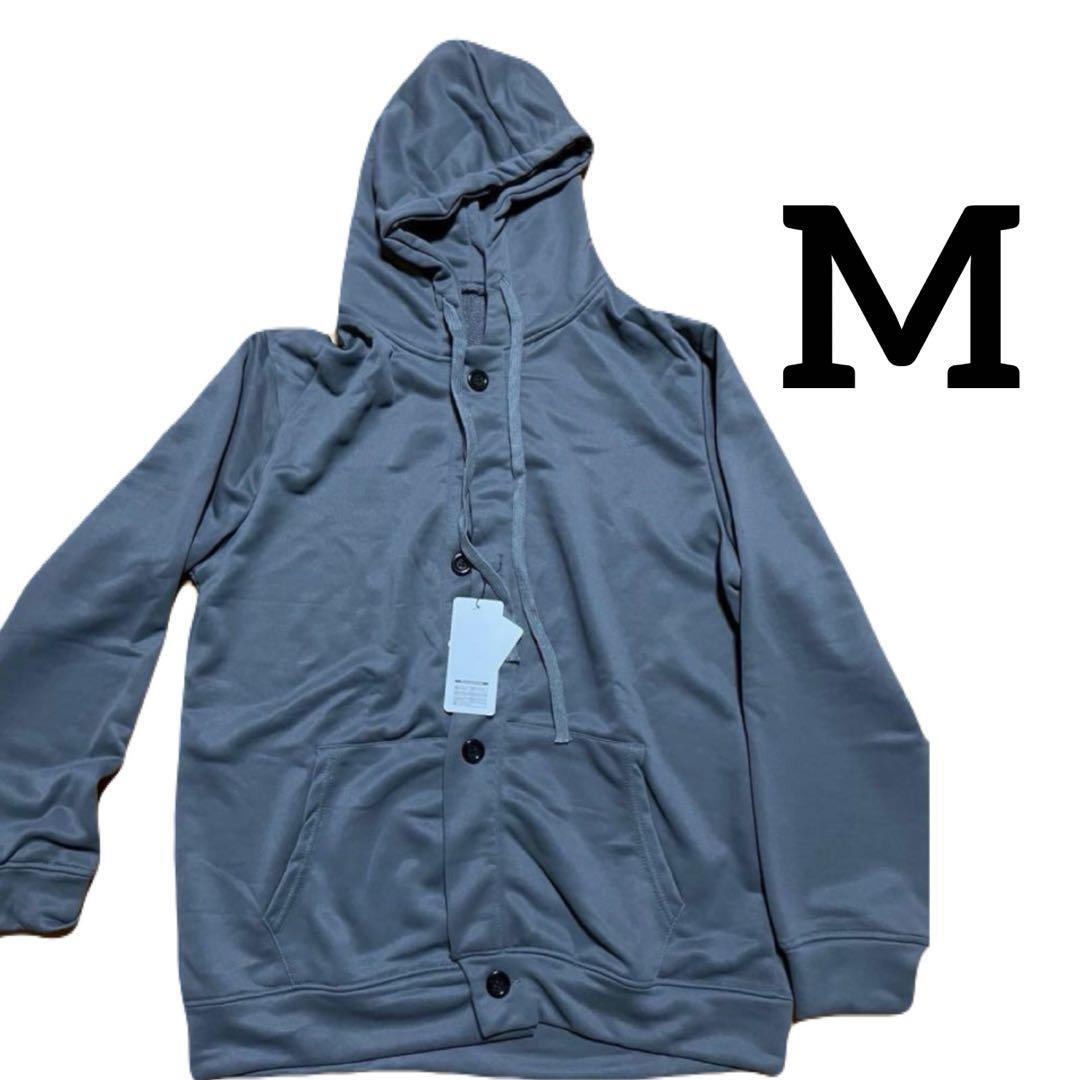 フード付きのグレーのボタンデザインパーカー、Mサイズ、快適な着心地。