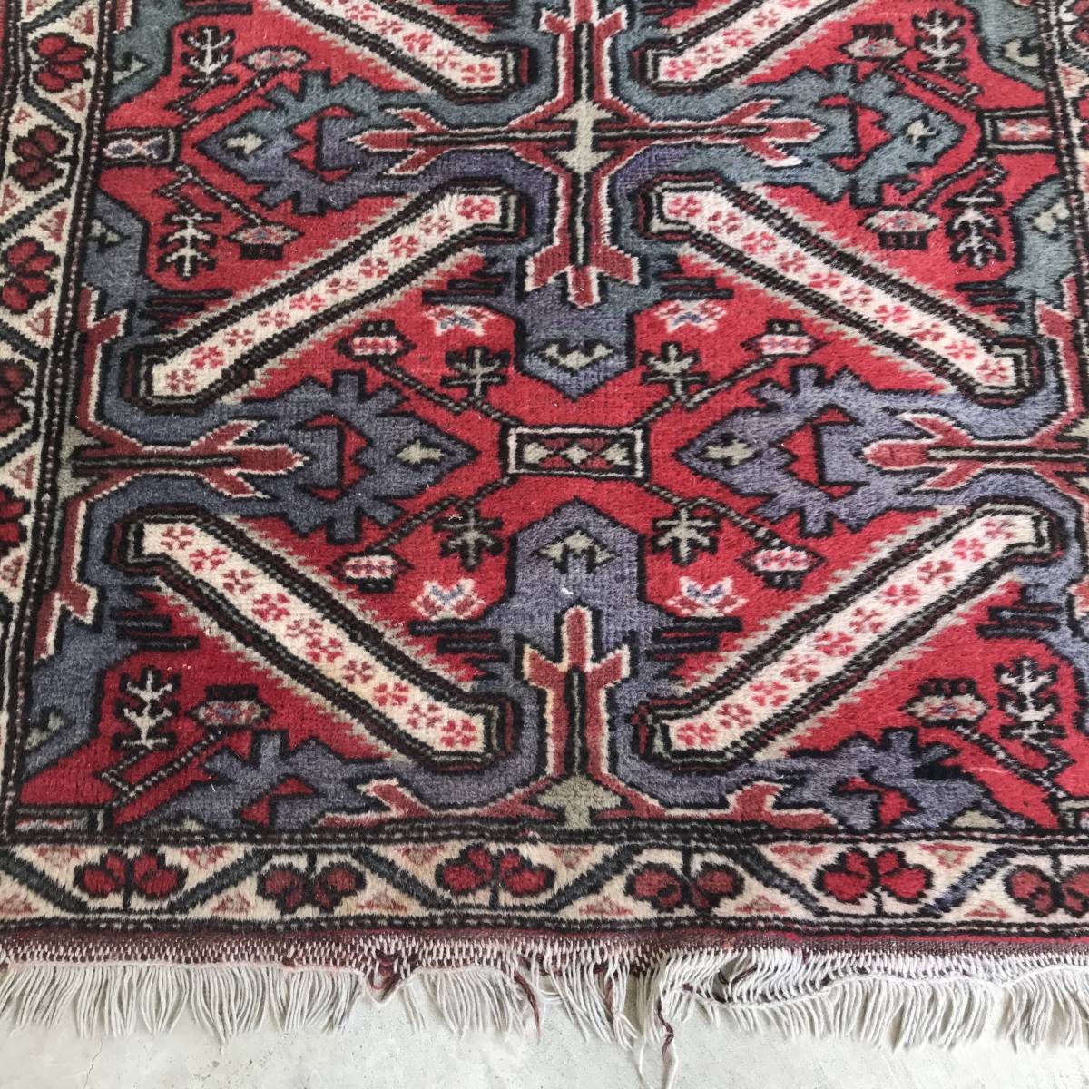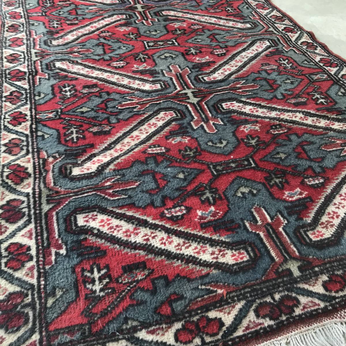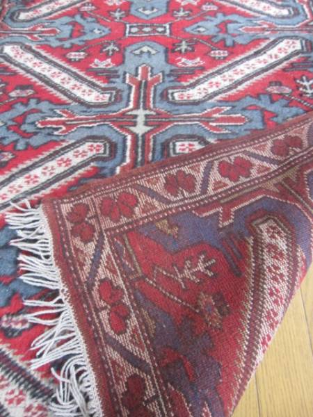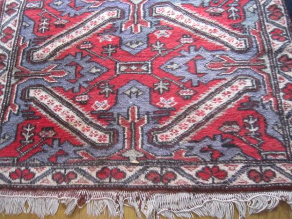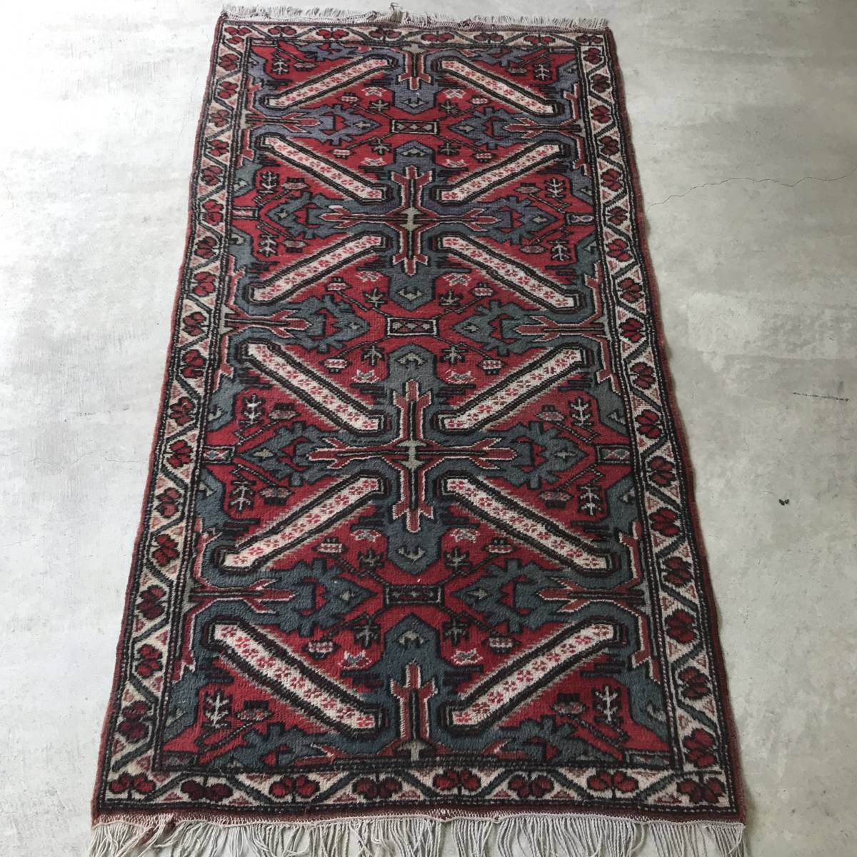 ★★オールドペルシャ絨毯です。伝統と文化が刻まれた独得のデザインと色彩です。その巧みな織り技術は、世界中の人々に偉大な世界の文化遺産として生き続け、さらに次の世代に引き継がれていくことでしょう。こういったハンドメイドの絨毯は、経年と適度な使用感がその価値を高めるといわれています。玄関やフローリング、カフェや美容院アパレルの内装など多用途にご使用いただけると思います。 古い物ですので色あせや僅かな汚れはありますが、大きく目立った染みや汚れはありません。サイズはフリンジ含まず約185cm×100cmになります。肉厚なウールが特徴です。フリンジ付近の横糸が1本解れた感じですが、普段使用に問題はありません。 ノークレームノーリターンでお願いします。珍しい一枚です。 アンティークにご理解ある方よろしくお願いします。