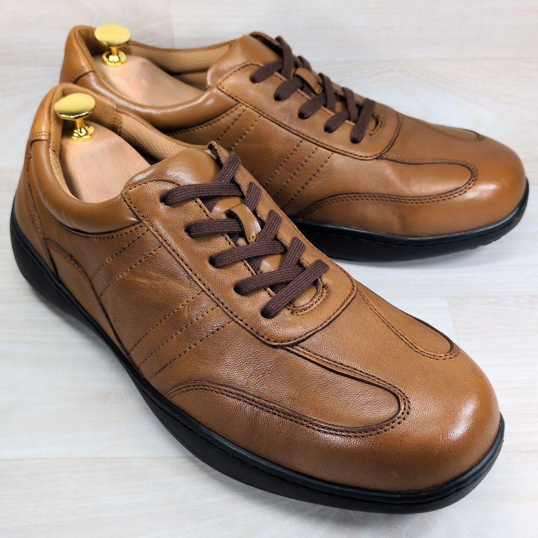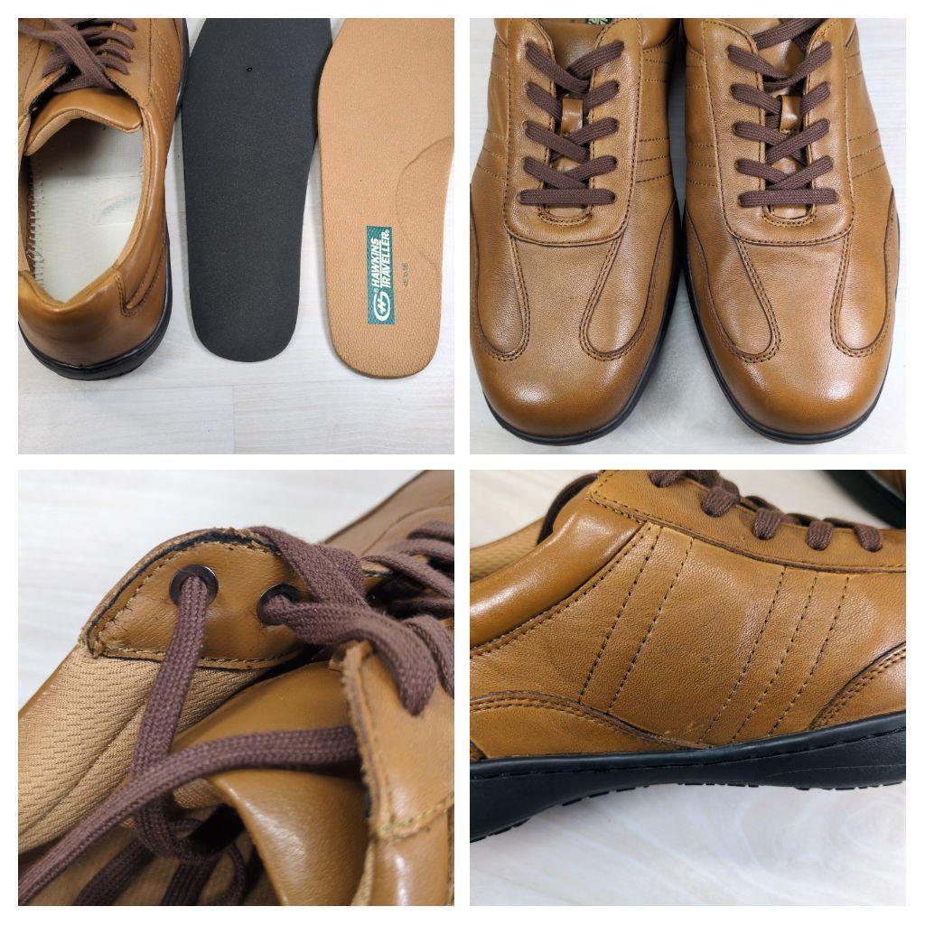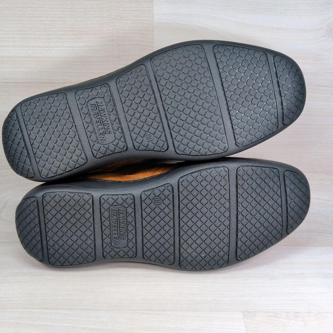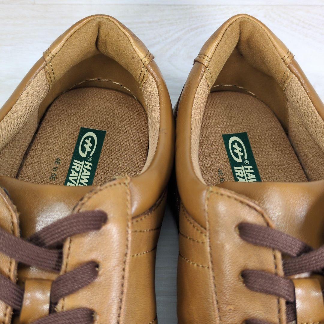 ホーキンストラベラーのレザーシューズです。中敷きの枚数で4E5Eとワイズの調整ができる幅広足の方におススメのシューズです。