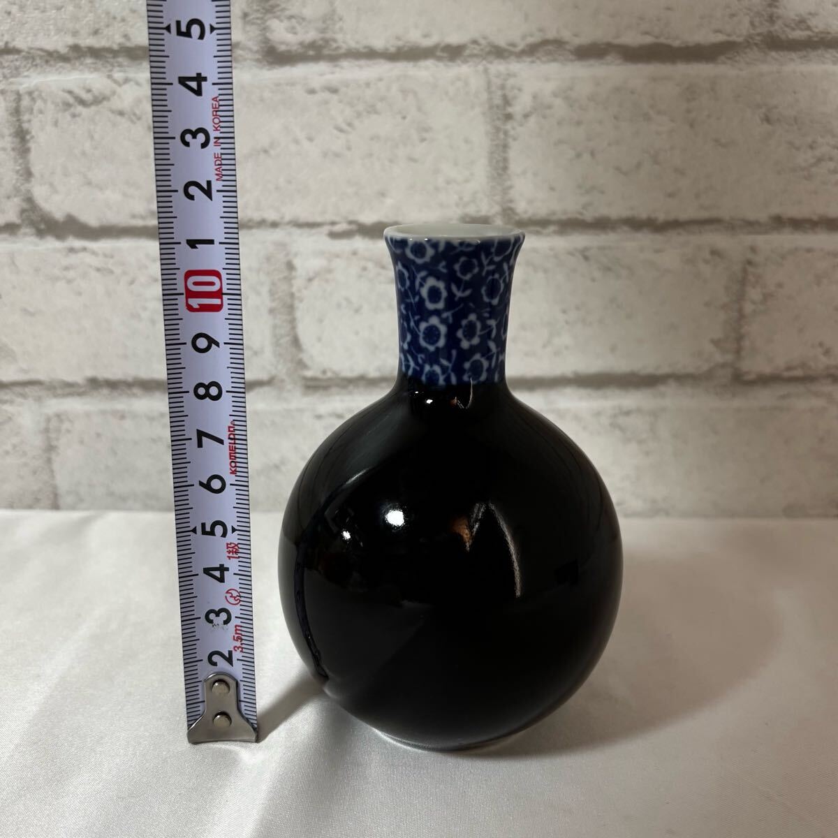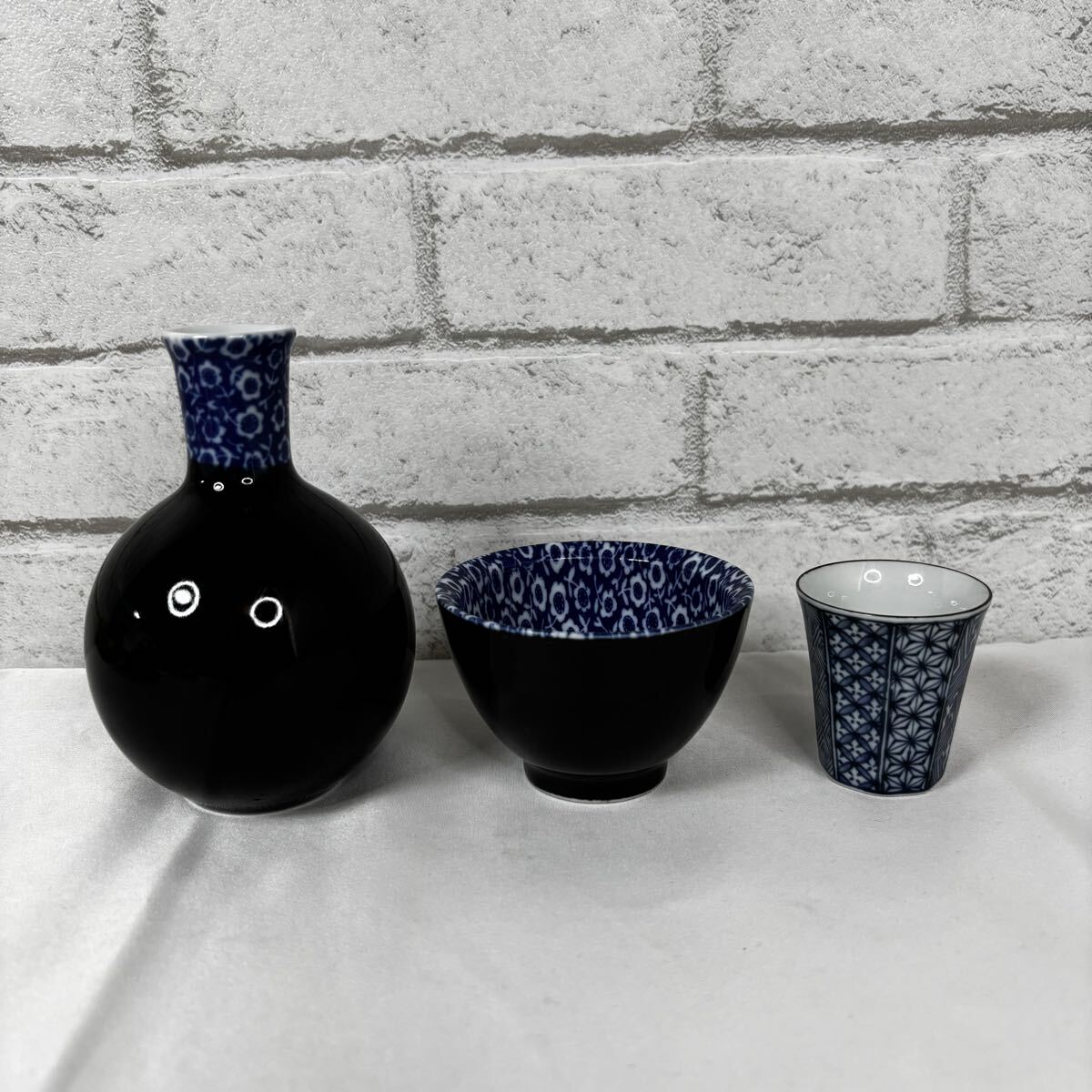 艶のある黒釉と青模様が特徴的な徳利・ぐい呑みに加え、繊細な幾何学模様が描かれたぐい呑みをセットにしています。