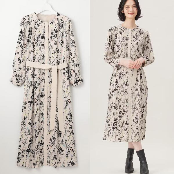 縦に流れるような植物柄が大人っぽく、サテンジョーゼットの美しいドレープ性も相まって、